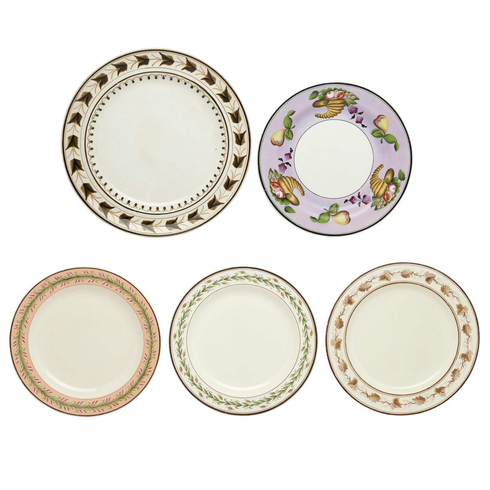 Comprising a two plates by Spode and Wedgwood, together with three Wedgwood 'Queensware' (creamware) plates with three different border patterns.
