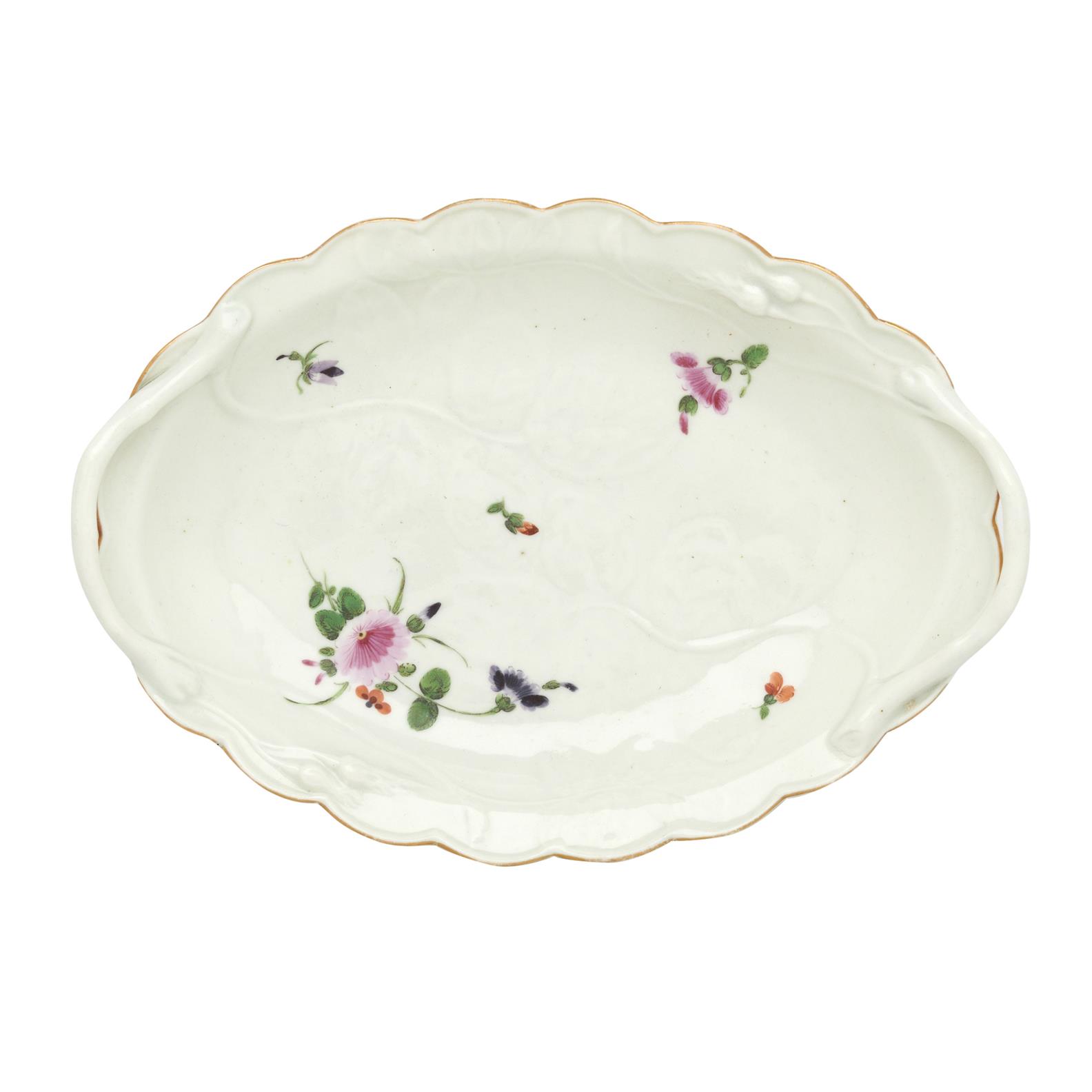 Of scolloped oval outline, in 'Blind Earl' pattern with two twig handles, decorated with small scattered floral sprigs