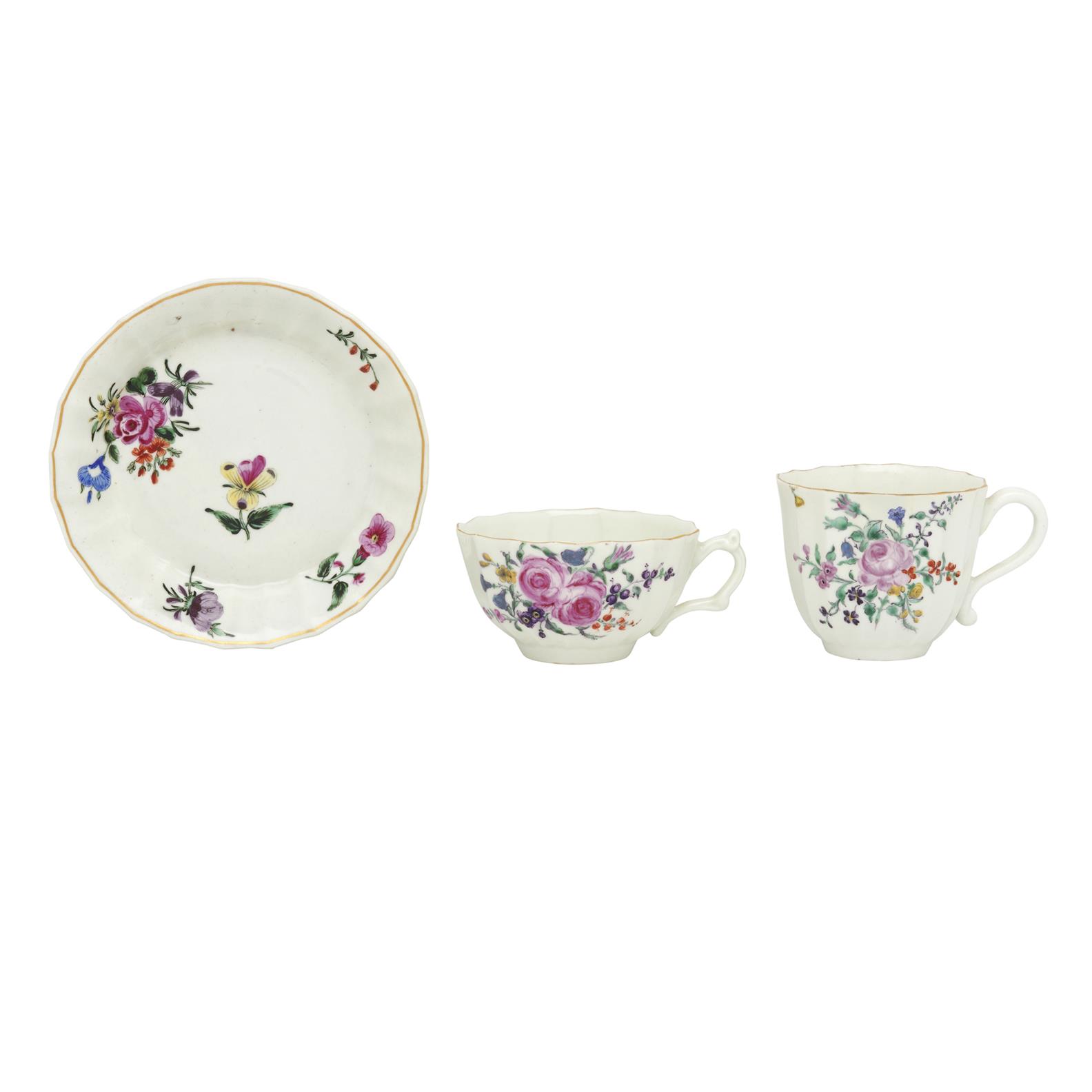 The tea and coffee cups each moulded with sixteen flutes, both decorated in polychrome colours with German flowers, together with similar saucer decorated in polychrome colours with simple flowers, all pieces with under-glaze blue square fret mark.