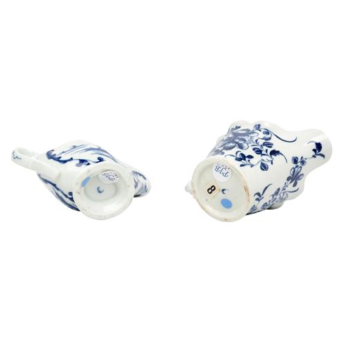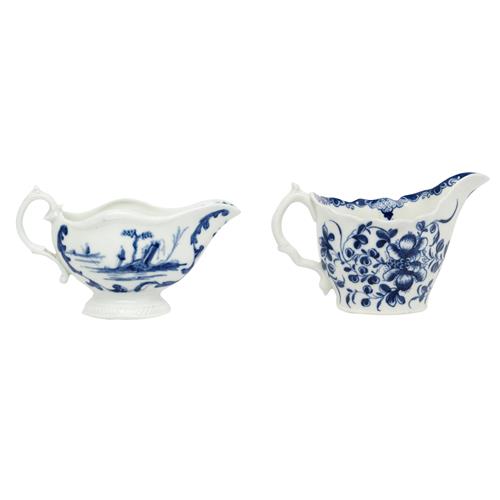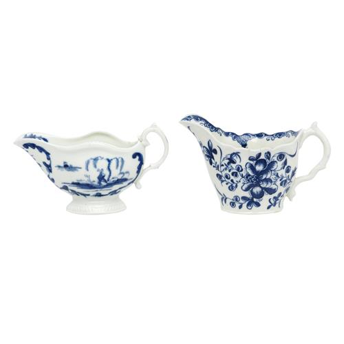 The first a 'Chelsea' shaped sauce boat with an ear-lobe handle decorated in under-glaze blue with a flower spray on each side and a scroll pattern on the interior of the rim, circa 1757 - 1759, together with a moulded cream-boat with a gadrooned edge and moulded handle with leaf thumb rest, painted in under-glaze blue with the 'One-Porter Landscape pattern, circa 1765.