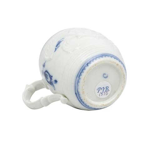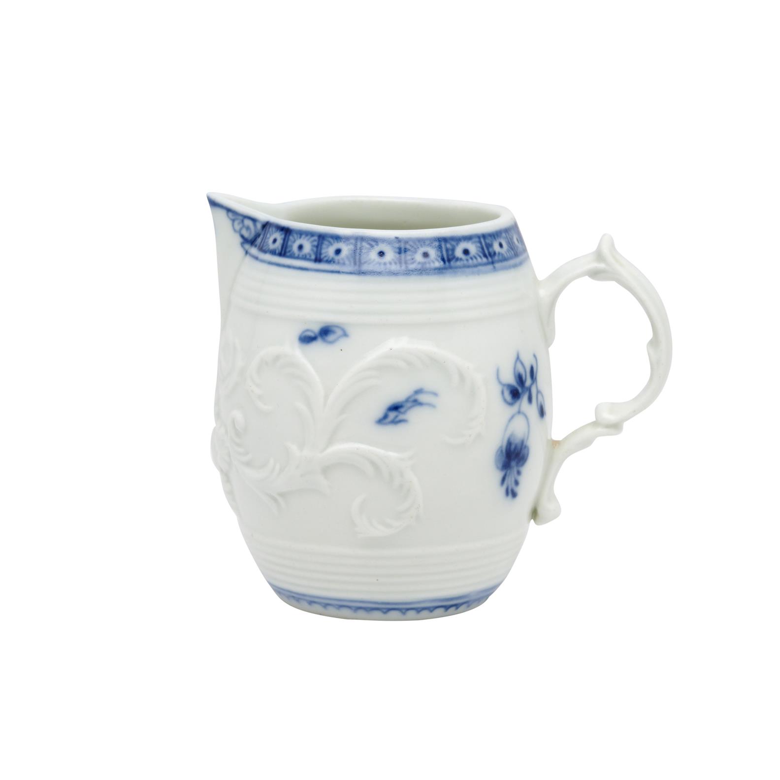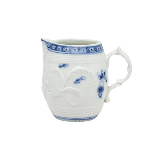 Of barrel form with a sparrow beak spout and a double scrolled handle, moulded beneath the spout with a flowerhead below a tied ribbon, flanked by scrollwork, painted in blue with scattered flower sprigs below a cell border, under-glaze blue crescent