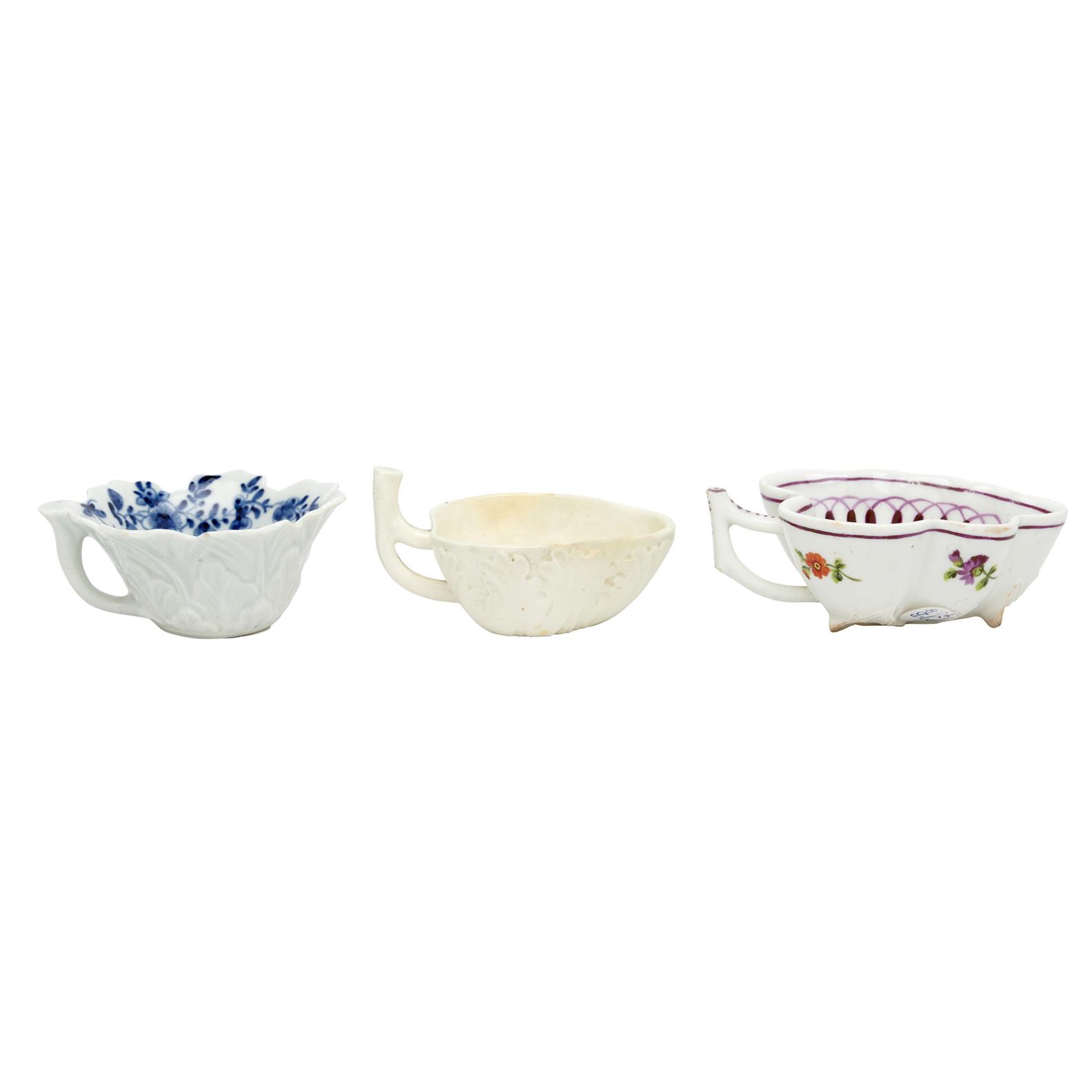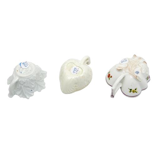 Wear to glaze and small chip on foot to the Staffordshire leaf-shaped butter boat. Minor chip to Vienna butter boat rim. A repair to rim to the Bow moulded leaf-shaped butter boat. Minor wear to paintwork.