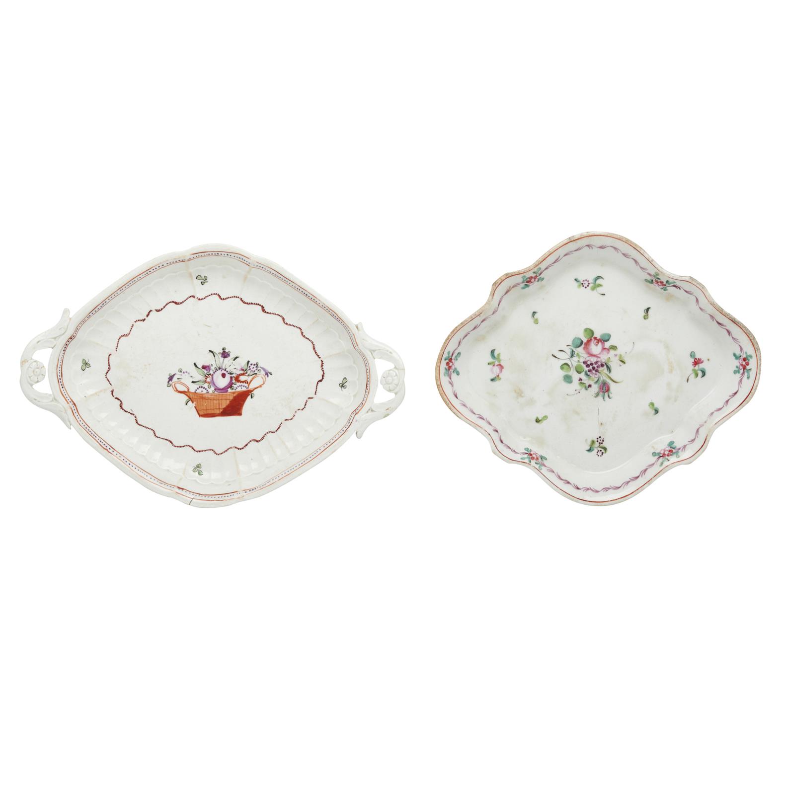 The first of lozenge form, näively painted with a basket of flowers, (pattern number 112), Factory 'X' England, circa 1790.