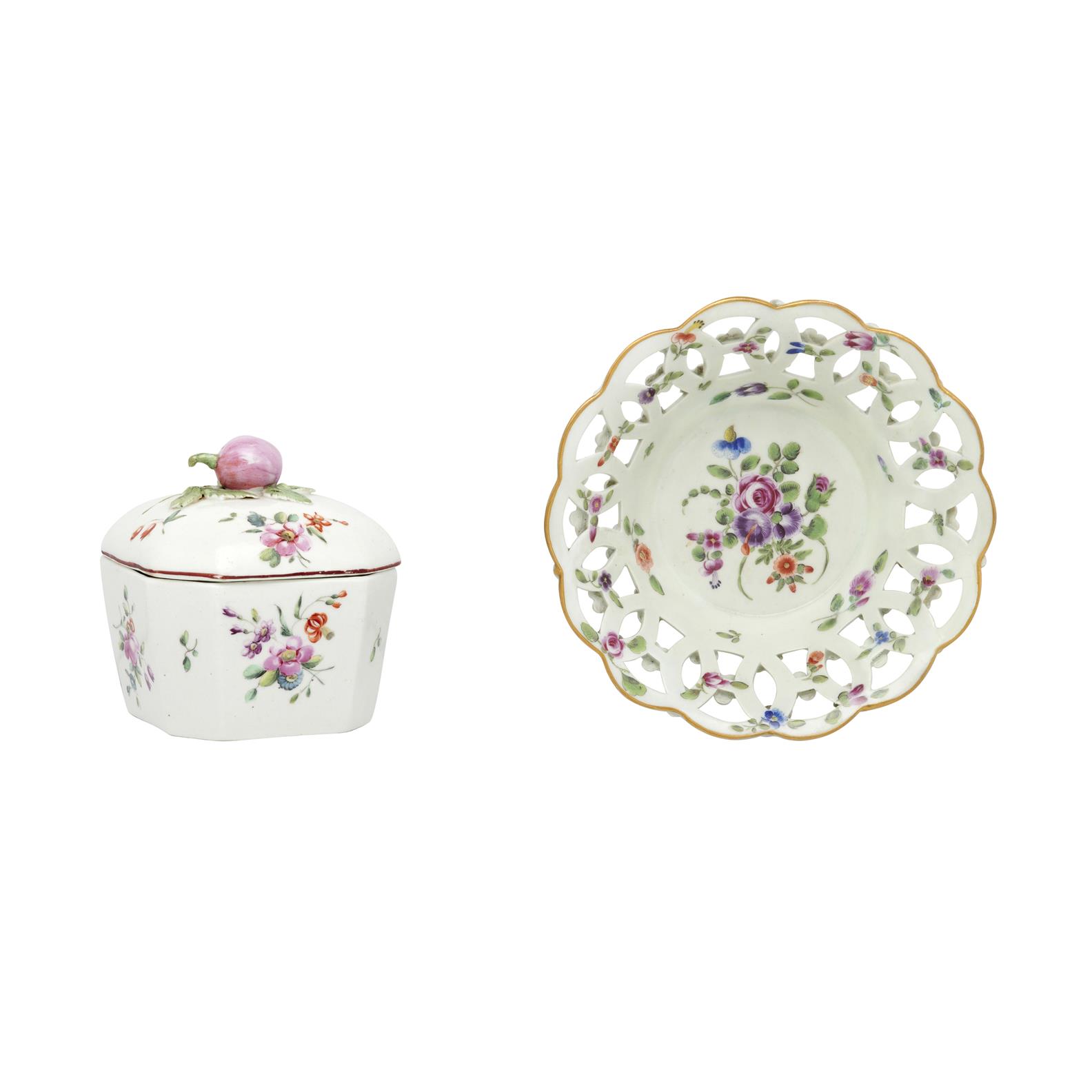 The Worcester basket, applied with floral sprigs, the inside painted with a spray of flowers on the base and scattered flowers and leaves around the basket weave, circa 1750