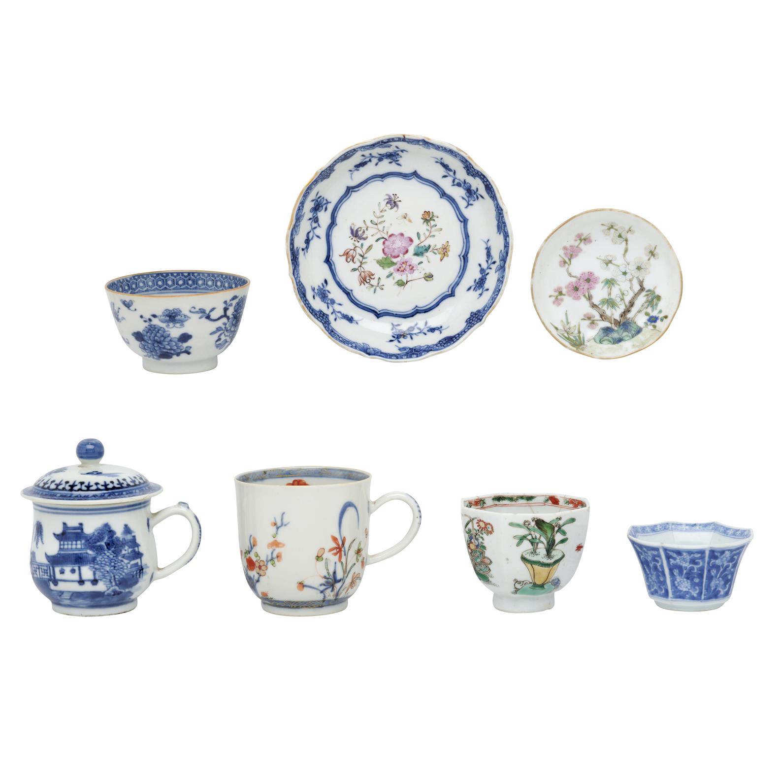 Minor chips to octoganal blue and white teabowl, hairline to round blue and white teabowl.