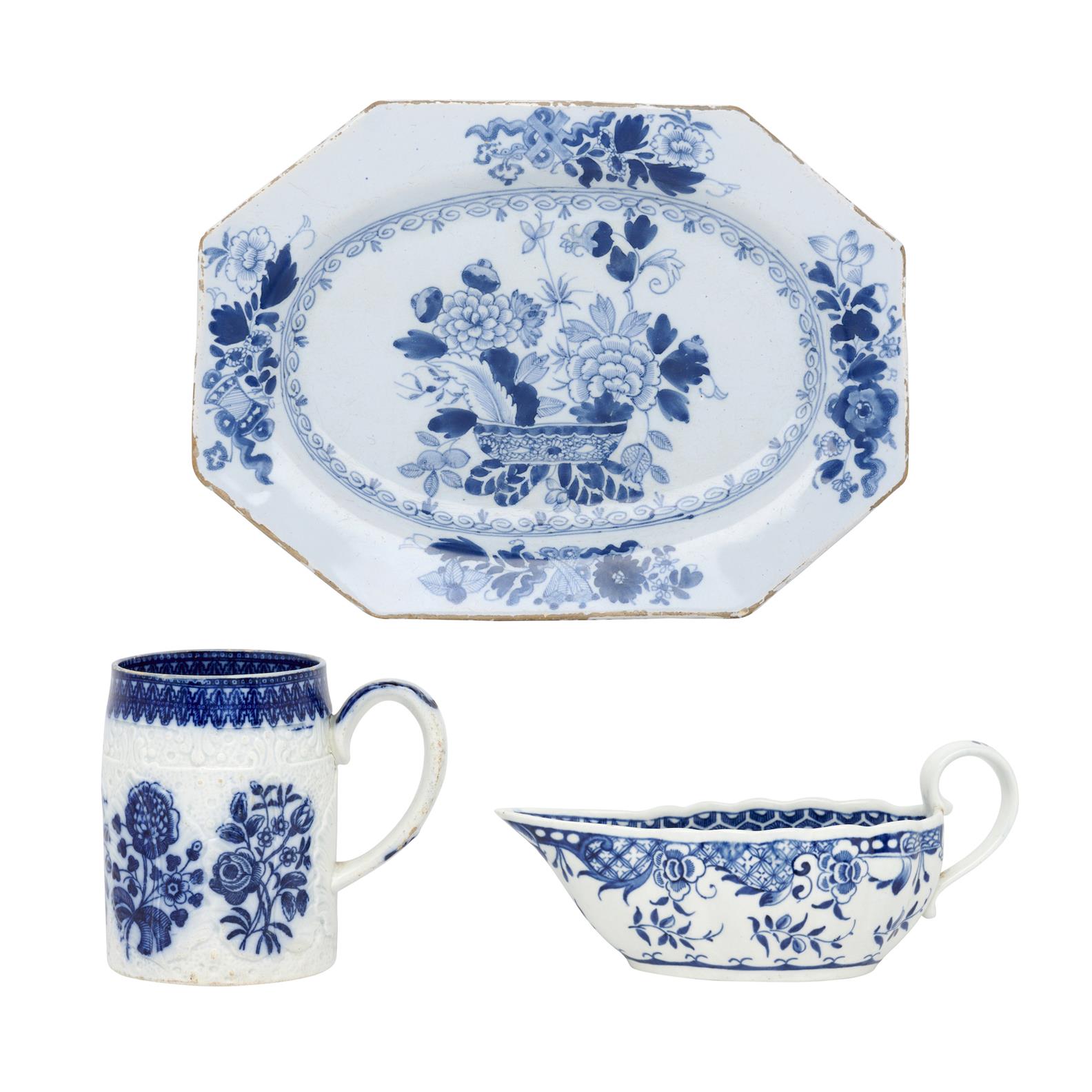The Dublin delft meat plate decorated in-glaze, in cobalt blue, with a central flower arrangement and precious objects on the rim, copying Chinese export porcelain.