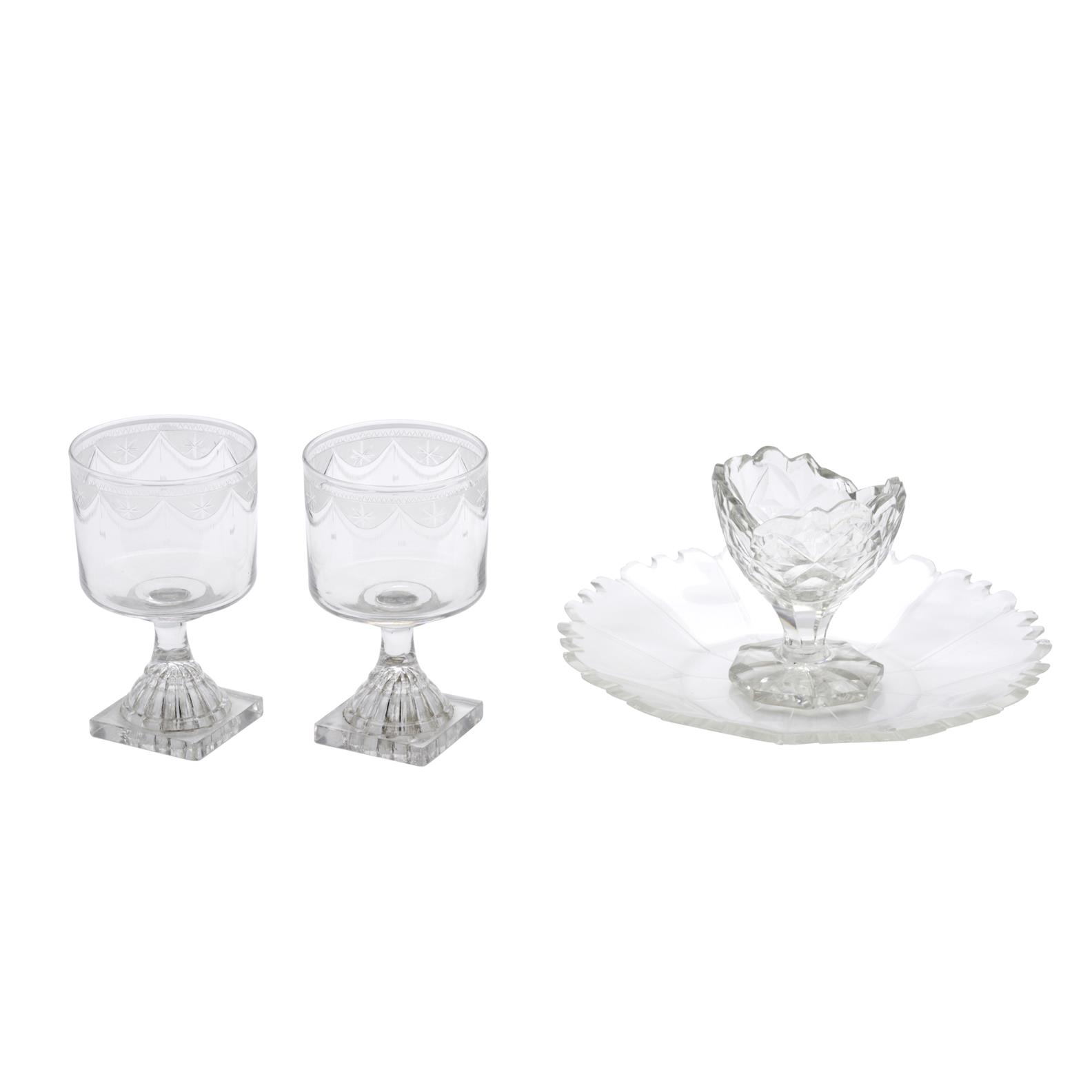 Comprising early Victorian glass dish, cut glass table salt, and a pair of etched glass rummers on lemon squeezer bases.