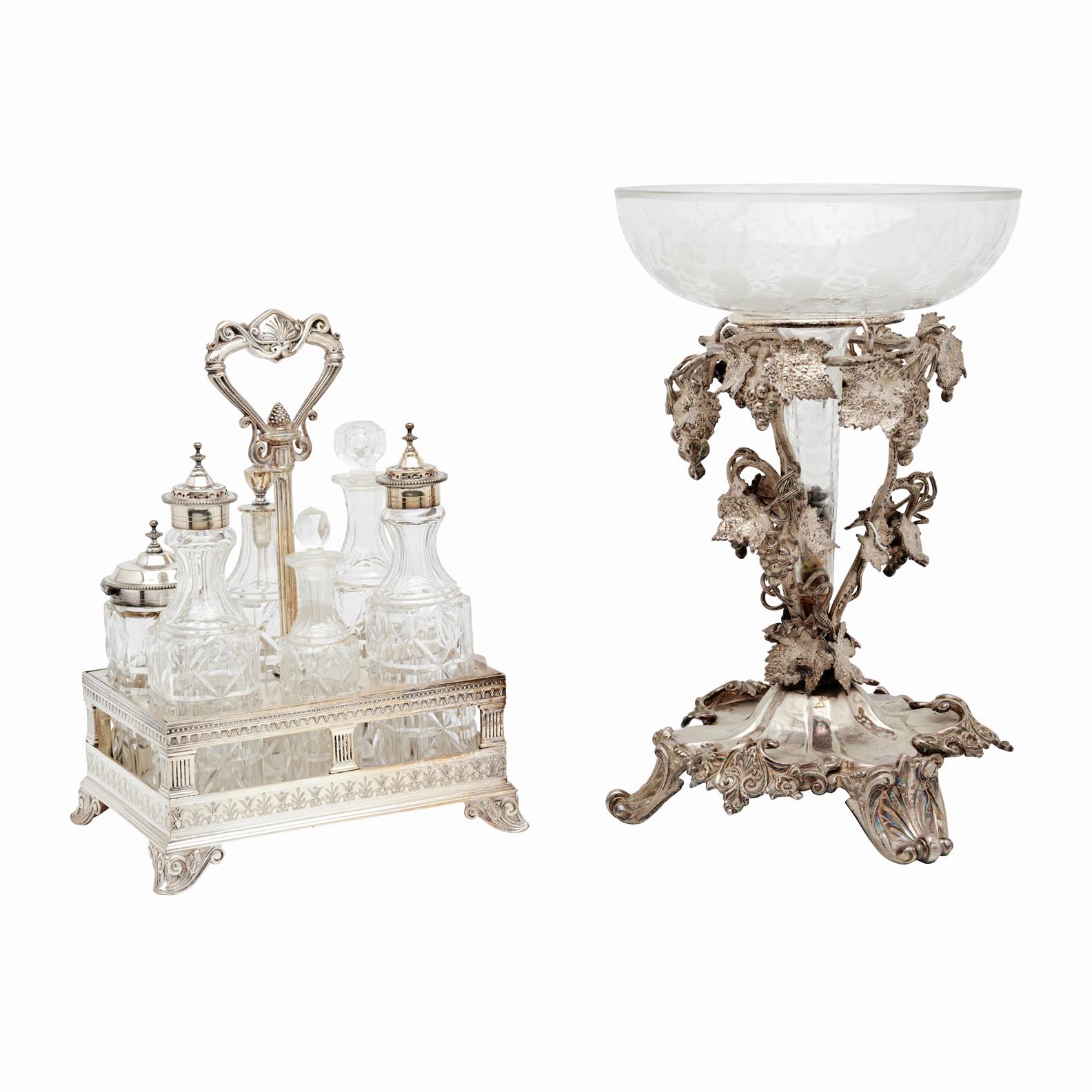 AN ELKINGTON & CO SILVER PLATE CRUET SET TOGETHER WITH A VICTORIAN SILVER PLATE CENTRE PIECE