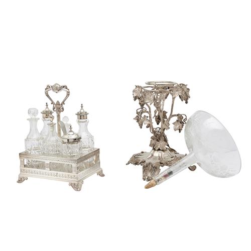 The cruet stand containing six cut crystal bottles and jars, the centrepiece featuring a leaf decorated stem with an etched glass insert