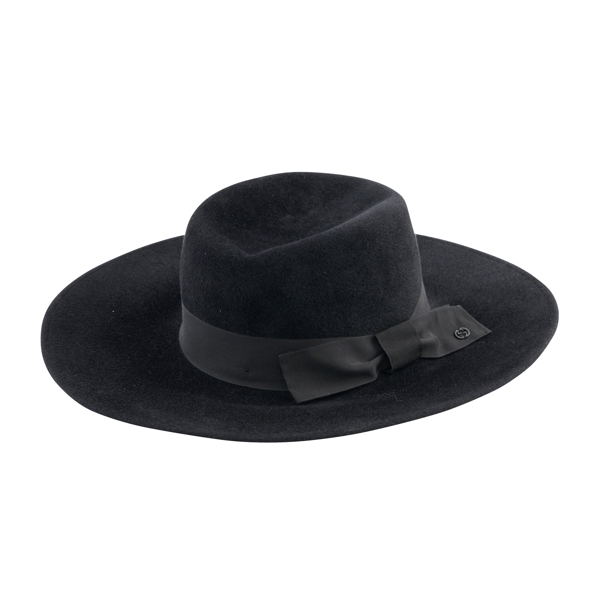 Styled in black felted wool with grosgrain ribbon detail, marked size L.