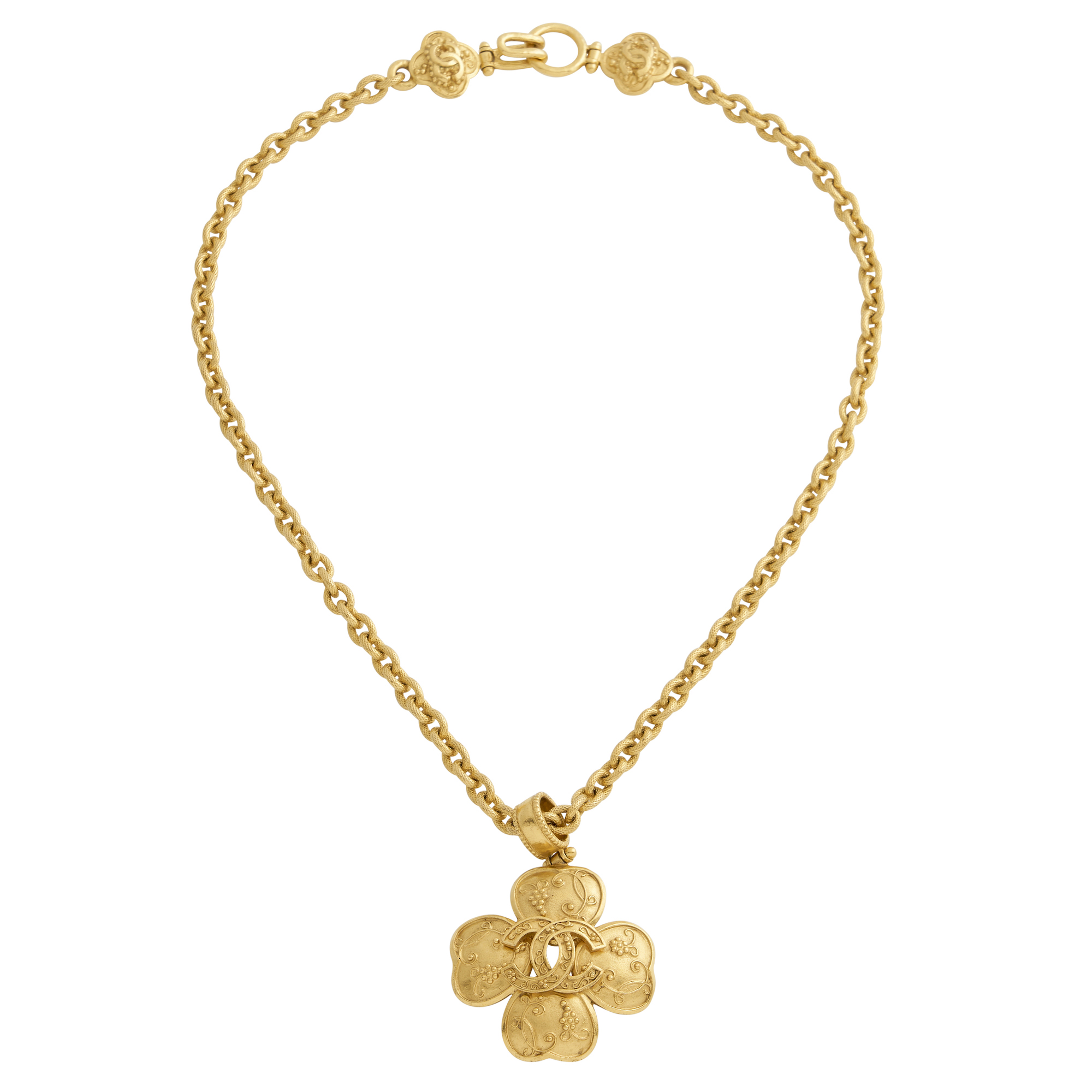 Styled featuring a clover pendant with central logo plaque, suspended upon a textured belcher chain in gold plate, terminating in a hook clasp, chain length 59cm, the pendant measuring 4.7 x 4.6cm.