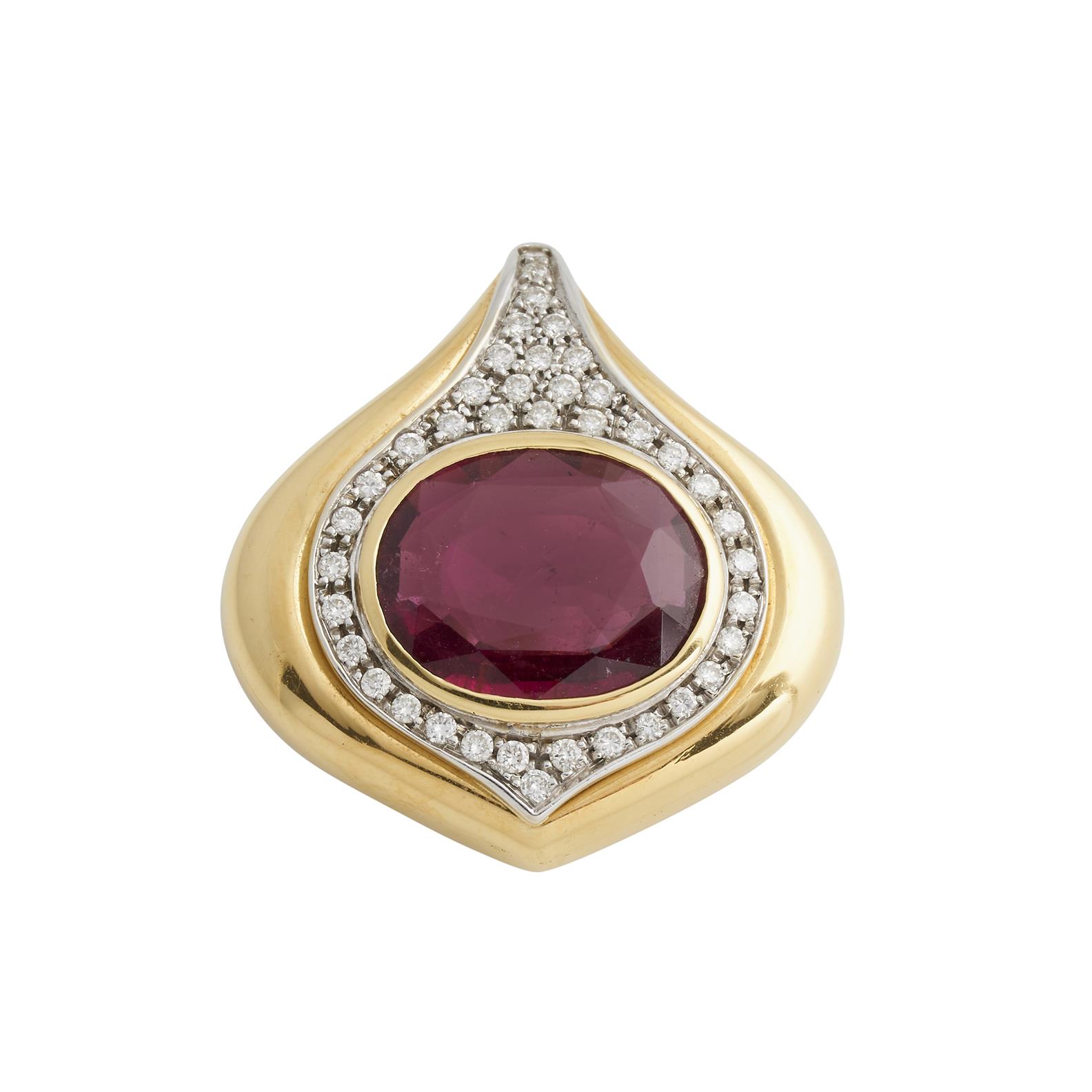 In our opinion, the pink tourmaline is of purplish red hue (rubellite type), with deep saturation, some typical inclusions, some minor scratches to the surface. The diamonds are bright and lively, probably G to H colour and VS to SI clarity, as gauged and graded within the limitations of the cutting style and the mounting.