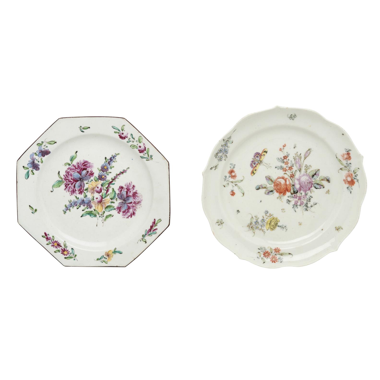The West pans plate, silver-shaped, painted with flower sprays and a butterfly, circa 1764.
