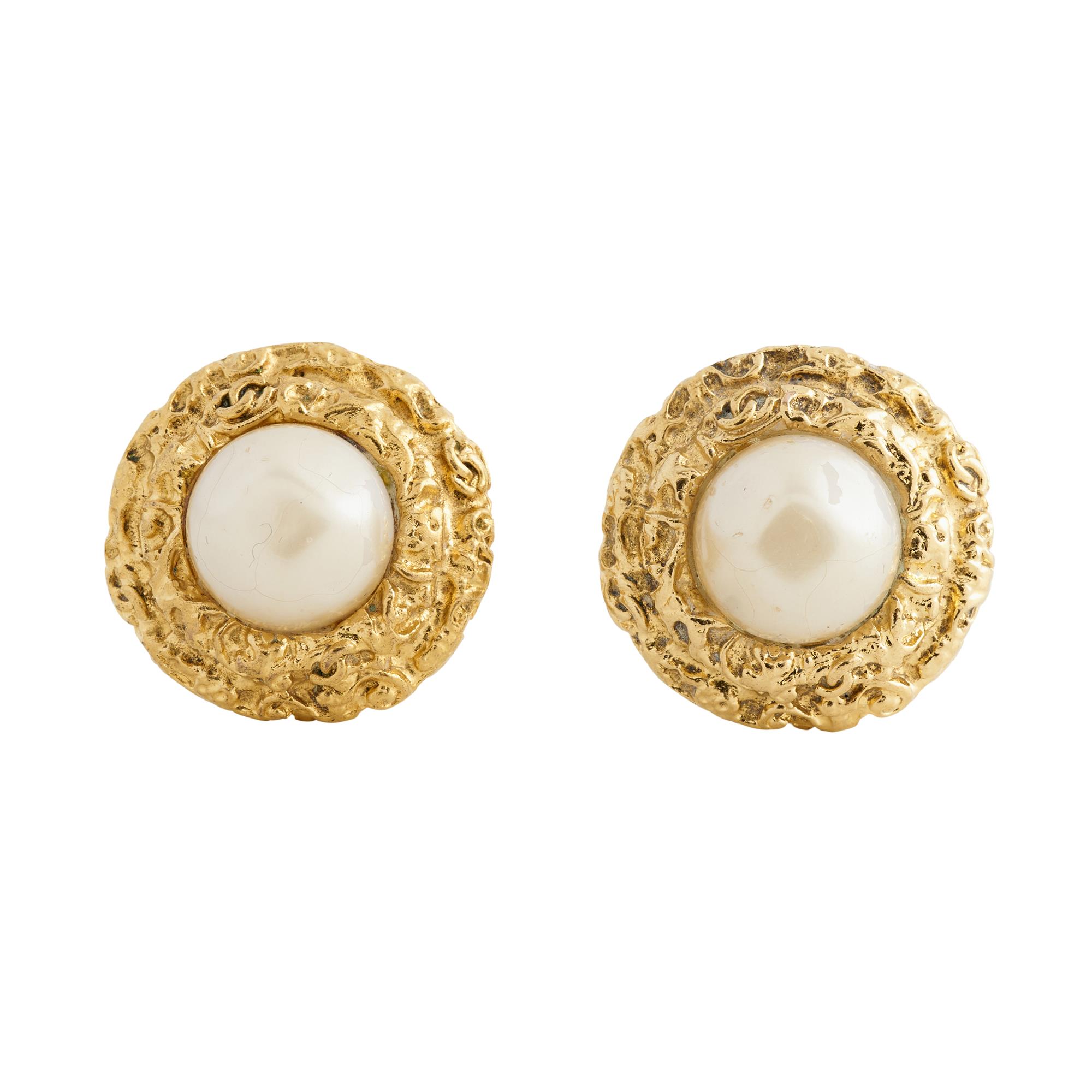 Styled featuring a simulant pearl center, to a surround of textured gold tone metal, featuring clip on fittings, diameter 27mm.