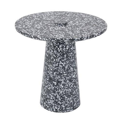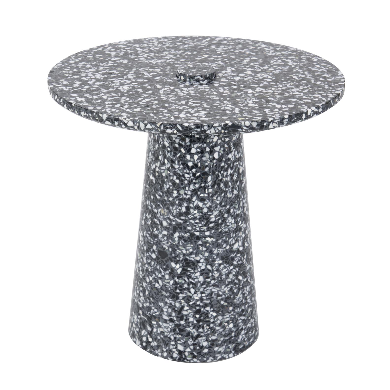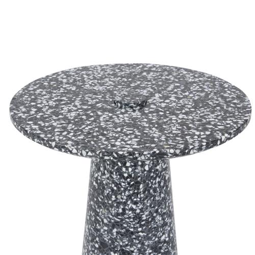 Round table top on tapered cylindrical base in black terrazzo.