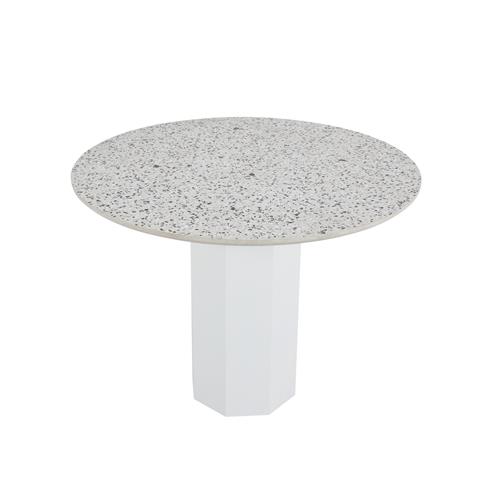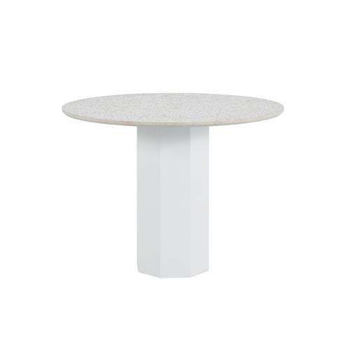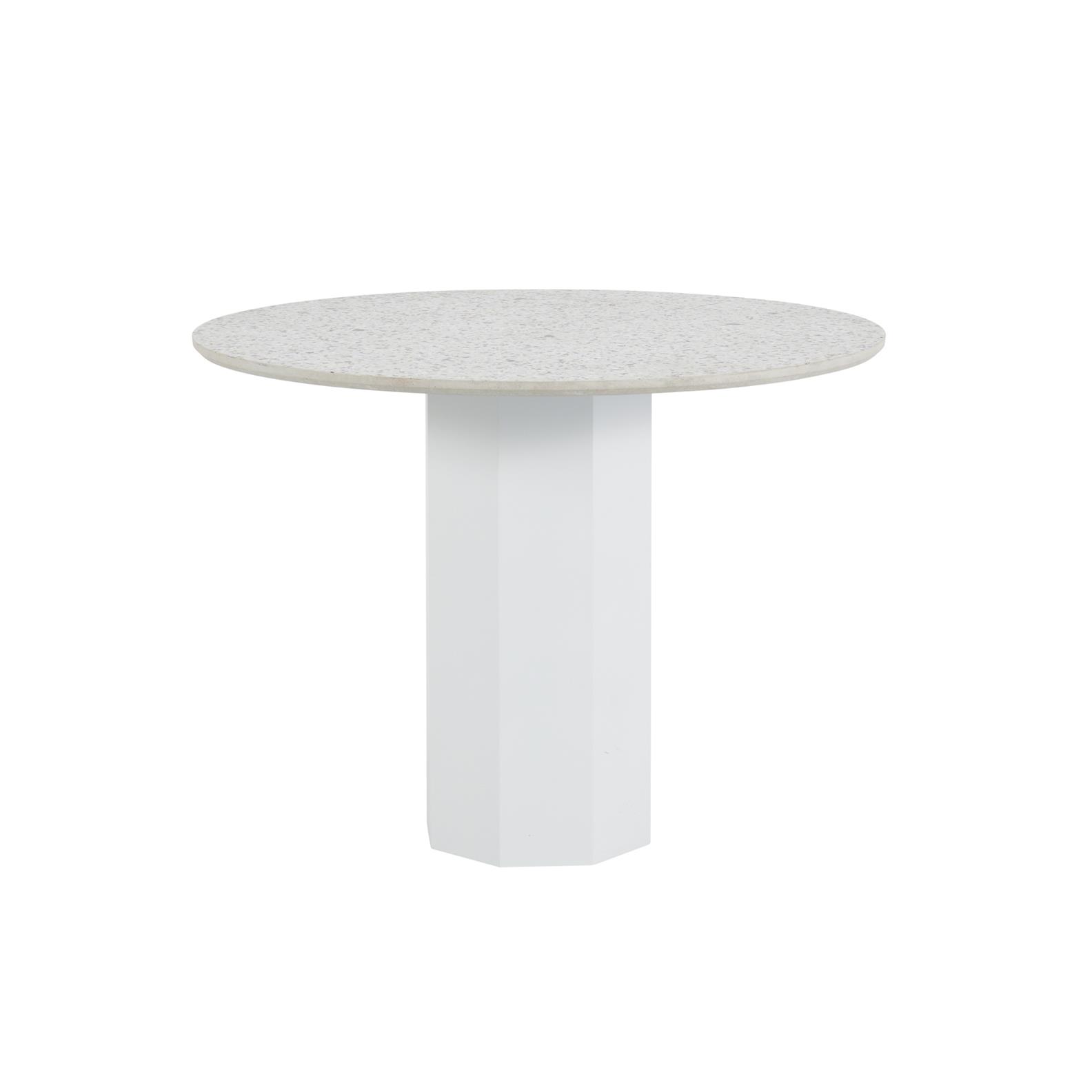 Round white terrazzo table top on hexagonal cylindrical steel base in white powder coat.