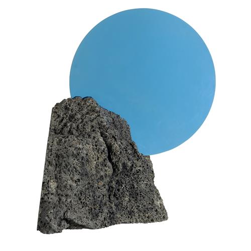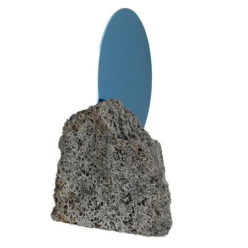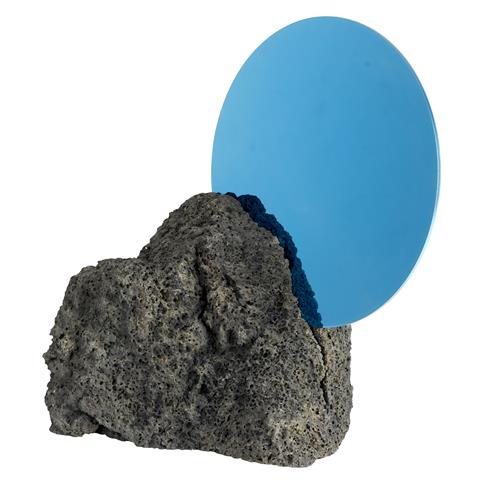 Blue hue disc form mirror embedded in contrasting natural lava stone specimen.