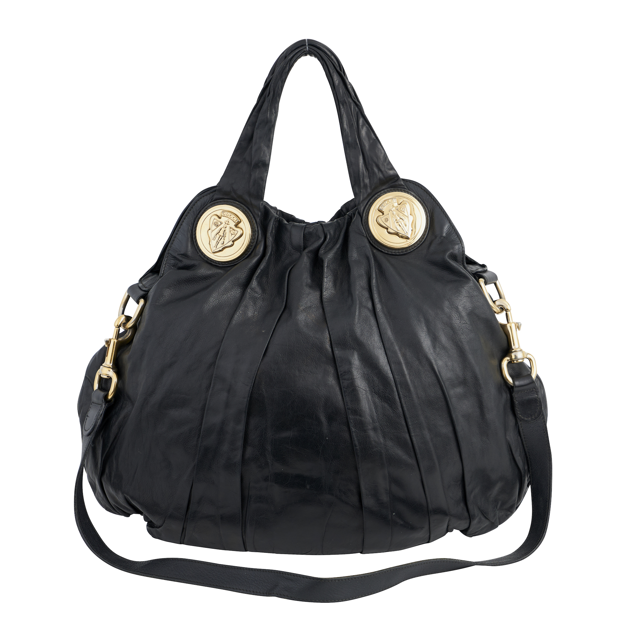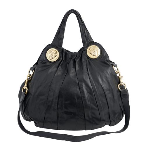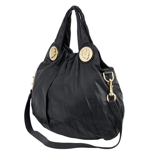 Styled in soft black pleated leather with gold tone hardware, featuring logo medallion details and detachable leather shoulder strap, 35 x 44 x 3cm.