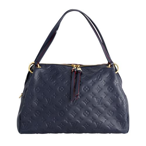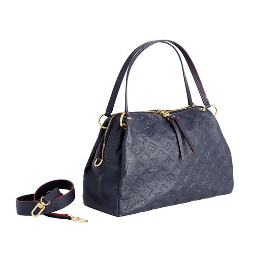 Styled in Marine Rouge Monogram Empreinte leather with gold tone hardware, featuring dual shoulder straps and optional crossbody strap, 26 x 36 x 15cm.