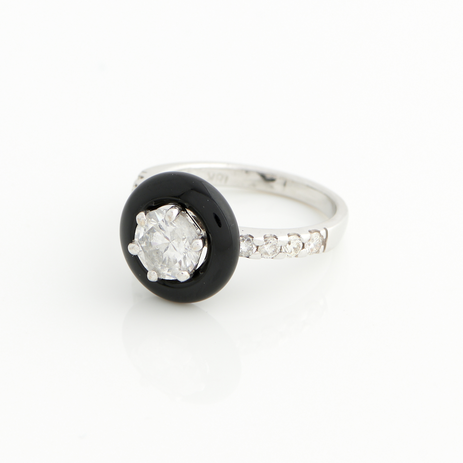 A DIAMOND AND ONYX RING IN 18CT WHITE GOLD, THE CENTRAL DIAMOND WEIGHING APPROXIMATELY 1.0CTS, WITH OTHER DIAMONDS TOTALLING 0.32CTS, SIZE L