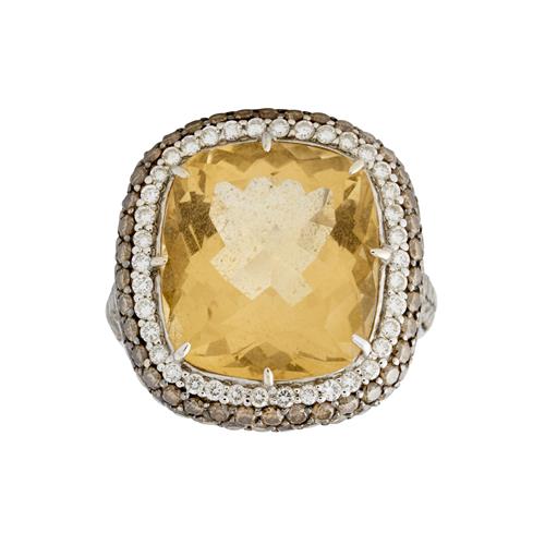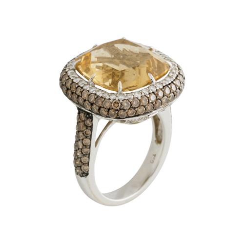 Of cluster design, centring a claw-set cushion-shaped citrine weighing approximately 8.97 carats to a gallery, shoulders and a double border set throughout with diamonds and fancy cognac coloured diamonds, size M, gross weight approximately 13.4 grams.