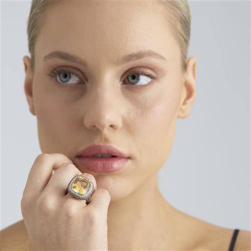 18CT WHITE GOLD, CITRINE, DIAMOND AND FANCY DIAMOND RING