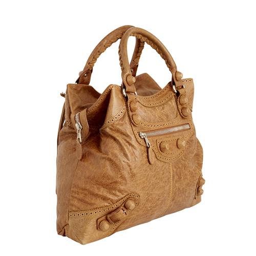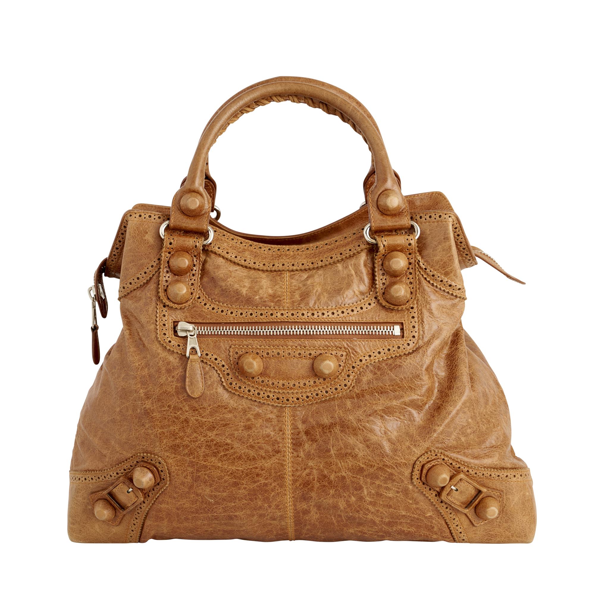 Styled in tan crinkled leather, with conforming studded detail and silver toned hardware, 37 x 45 x 9cm.