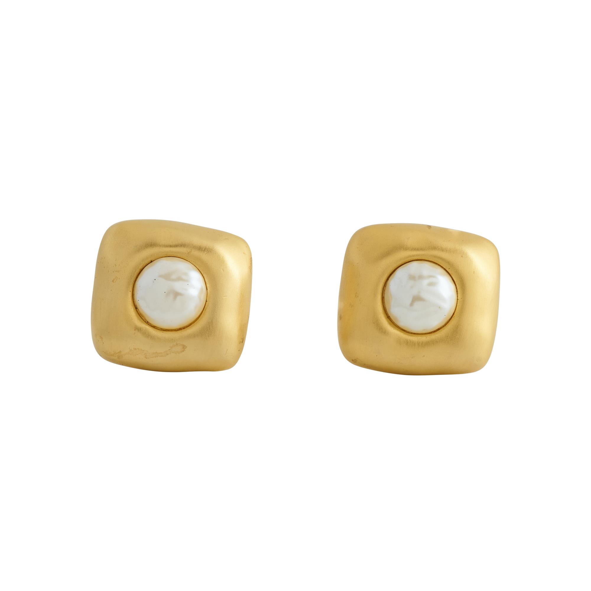 Styled featuring faux mabe pearl centres, to a surround of hammered brushed gold tone metal, to clip on fittings, 3.7cm square.