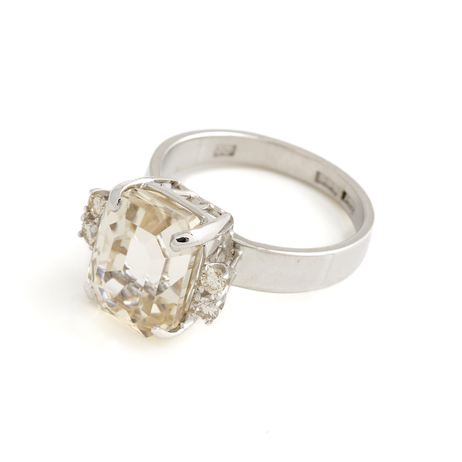 A YELLOW KUNZITE AND DIAMOND RING IN 14CT WHITE GOLD, THE KUNZITE WEIGHING 7.80CTS, SIZE N, 5.9GMS