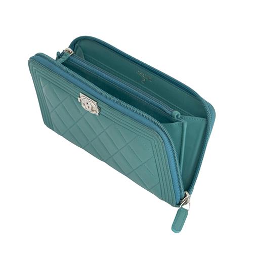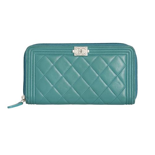 Styled in teal diamond quilted lambskin with silver tone hardware, 19 x 11cm.