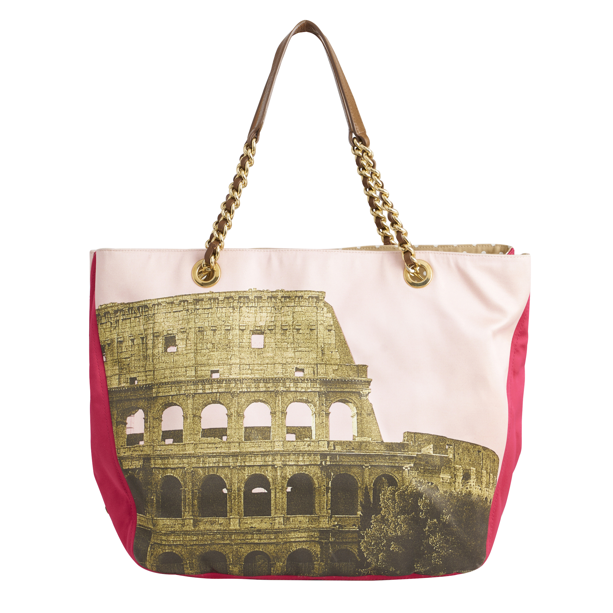 Styled in pink nylon and leather with gold metal hardware, 30 x 33 x 12cm.