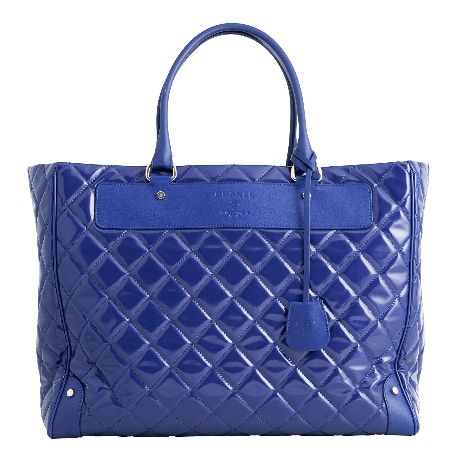 Styled in blue diamond quilted patent leather with tonal lambskin trim and silver tone hardware, featuring dual rolled top handles and full zip closure, 40 x 33 x 14cm.