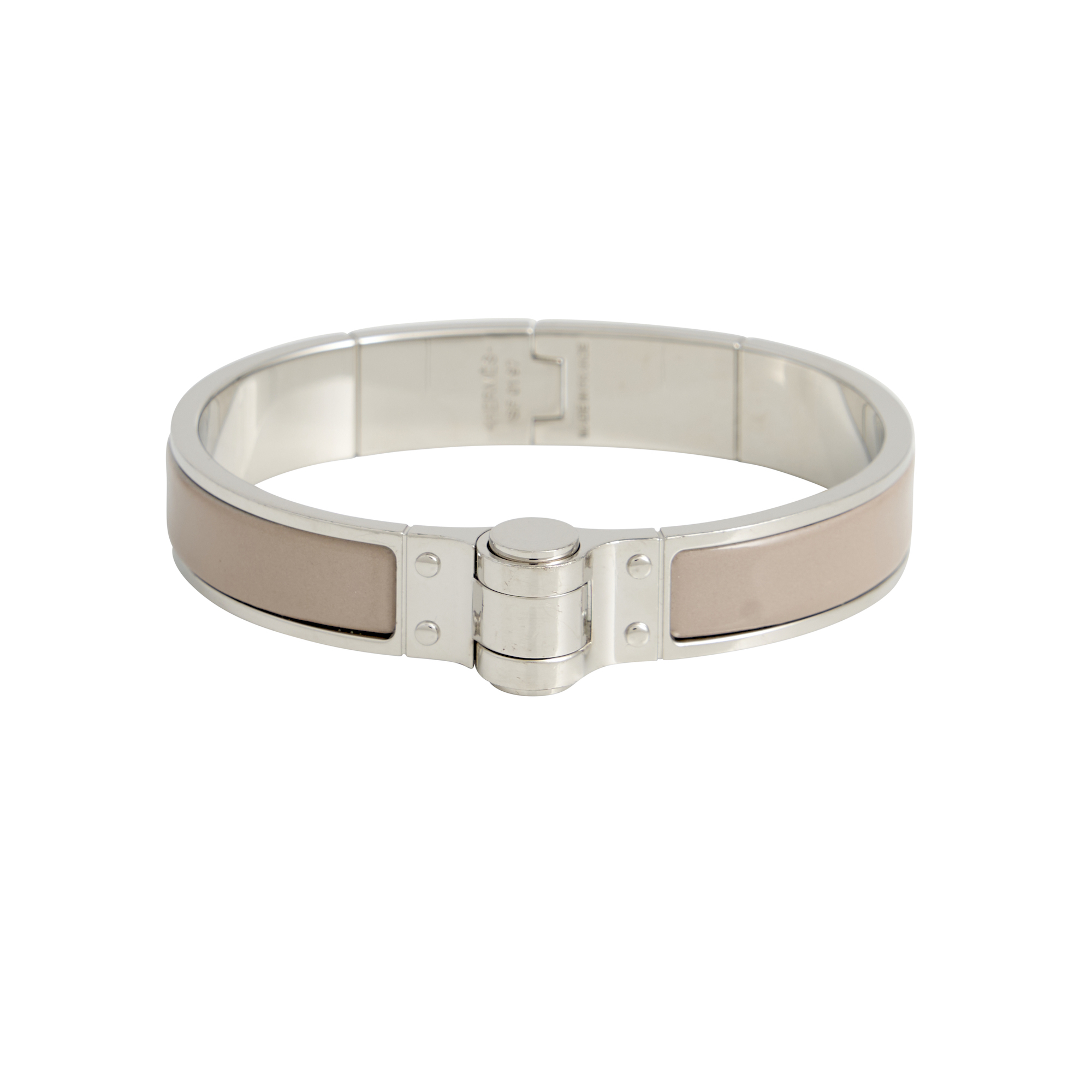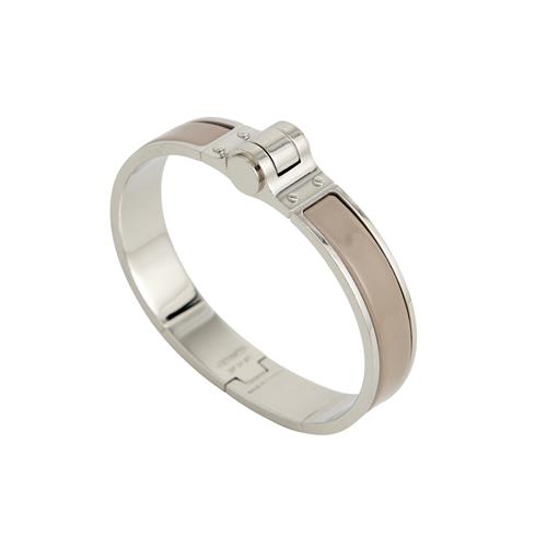 Styled featuring beige enamel in palladium plated hardware, 6.5 x 5cm.