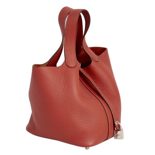 Styled in Rouge Clemence leather with silver tone hardware, 18 x 13 x 18 cm.