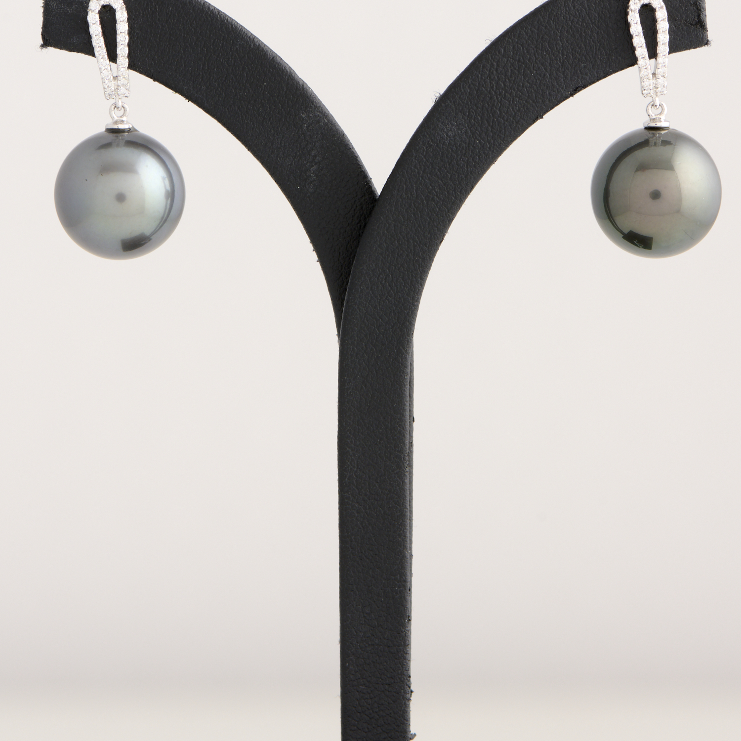 A PAIR OF TAHITIAN PEARL AND DIAMOND EARRINGS IN 18CT WHITE GOLD, THE PEARLS MEASURING APPROXIMATELY 13MM, TO POST AND BUTTERFLY FITTINGS, 28MM