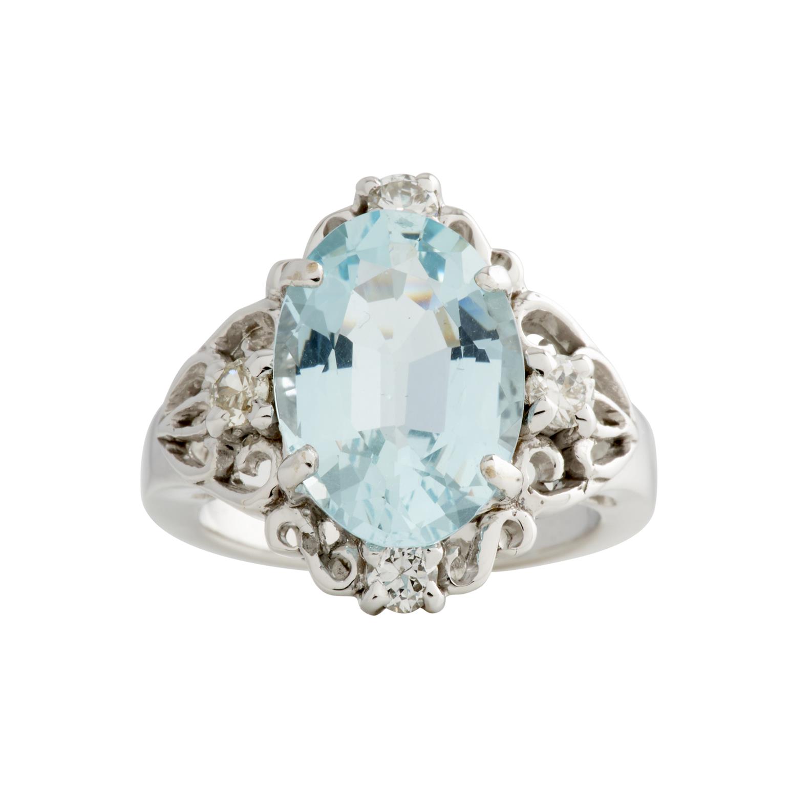 AN AQUAMARINE AND DIAMOND RING IN 18CT WHITE GOLD, THE AQUAMARINE WEIGHING 5.10CTS, WITH DIAMONDS TOTALLING 0.26CTS, SIZE N, 8.4GMS