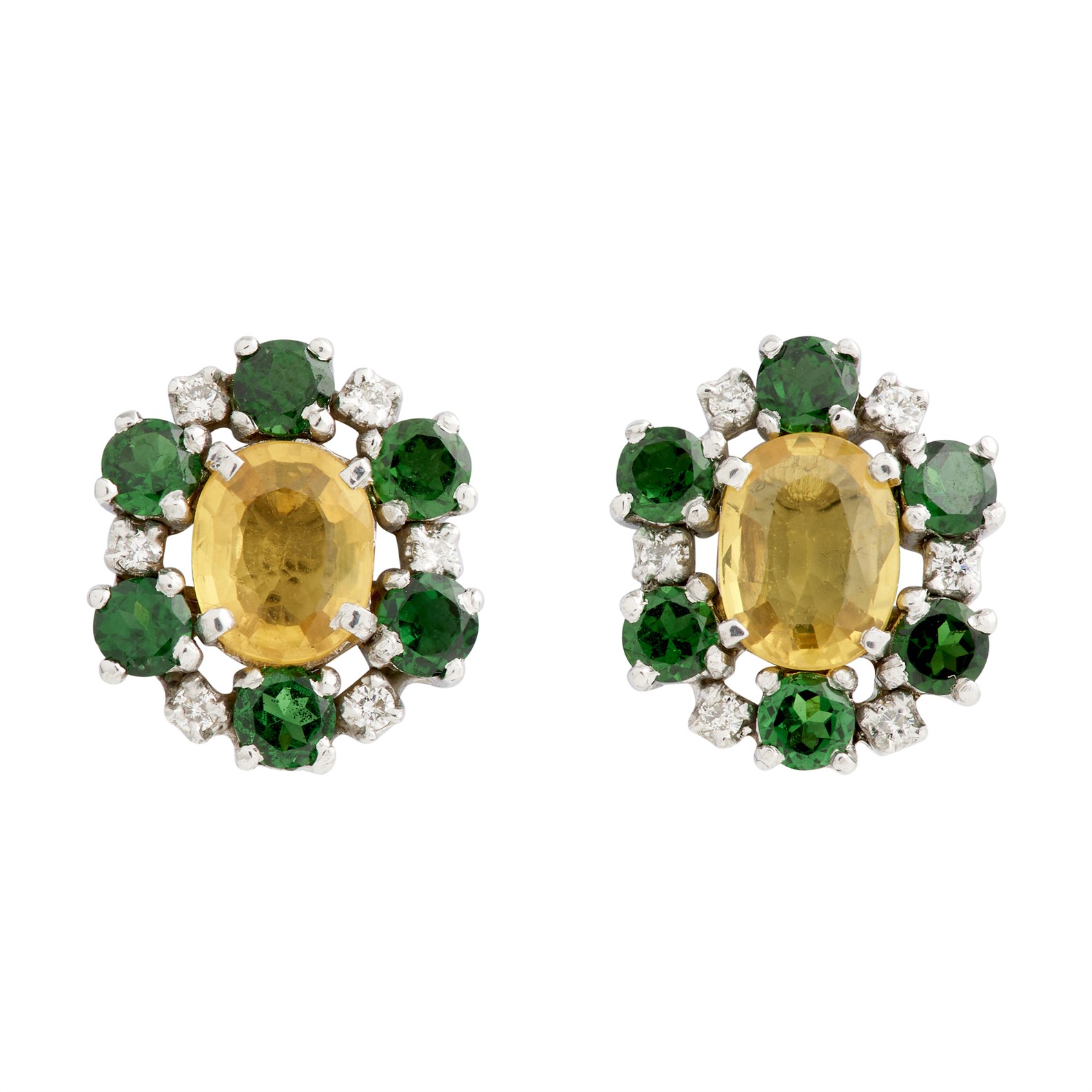 A PAIR OF YELLOW SAPPHIRE, TSAVORITE GARNET AND DIAMOND EARRINGS IN 18CT WHITE GOLD, TO POST AND BUTTERFLY FITTINGS, THE SAPPHIRES TOTALLING 2.28CTS, THE GARNETS TOTALLING 2.60CTS, LENGTH 15.5MM, 5.5GMS