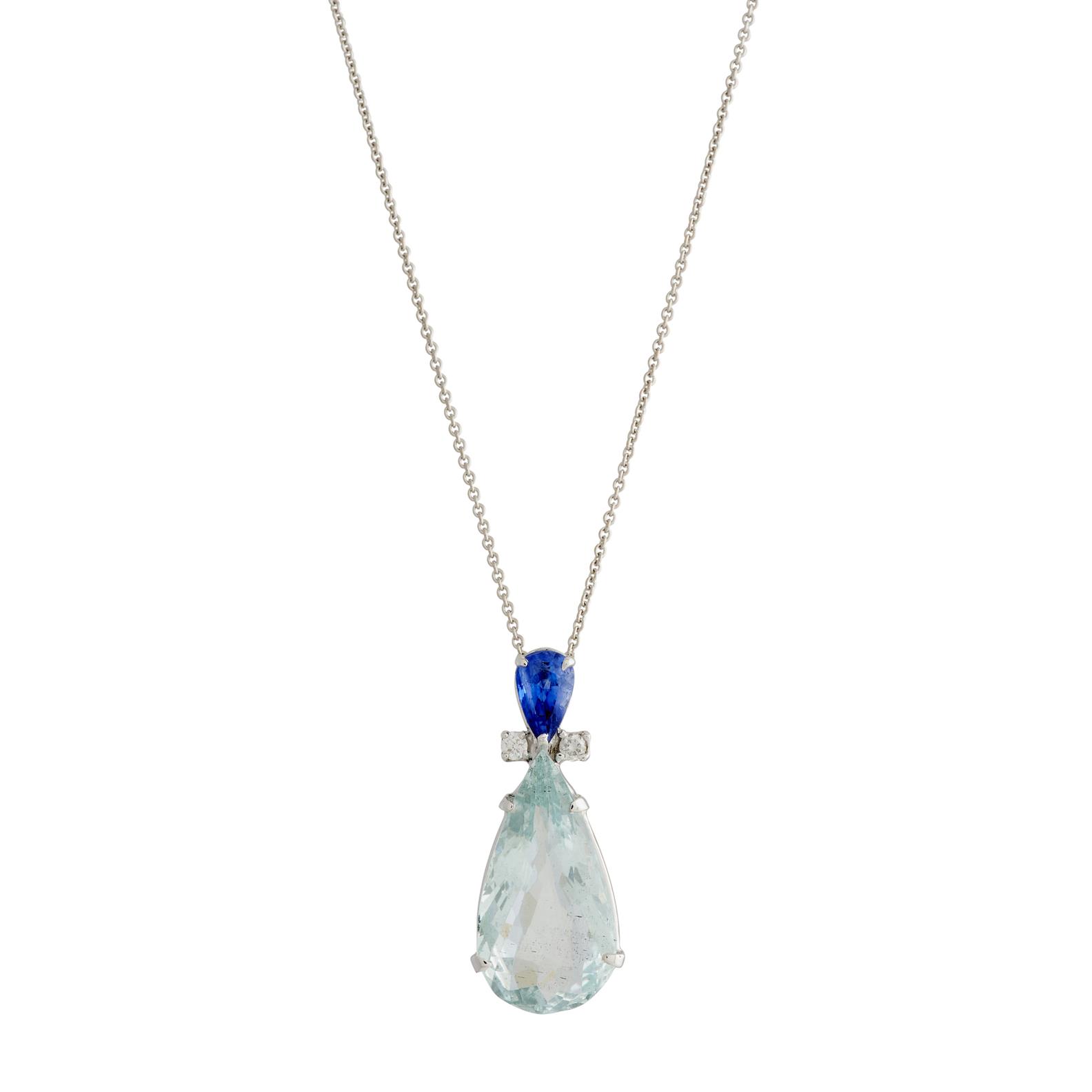 AN AQUAMARINE, SAPPHIRE AND DIAMOND PENDANT NECKLACE IN 18CT WHITE GOLD, THE AQUAMARINE WEIGHING 9.32CTS, WITH THE SAPPHIRE WEIGHING 1.05CTS, AND DIAMONDS TOTALLING 0.08CTS, PENDANT 29MM, CHAIN 450MM, ACCOMPANIED BY A VALUATION