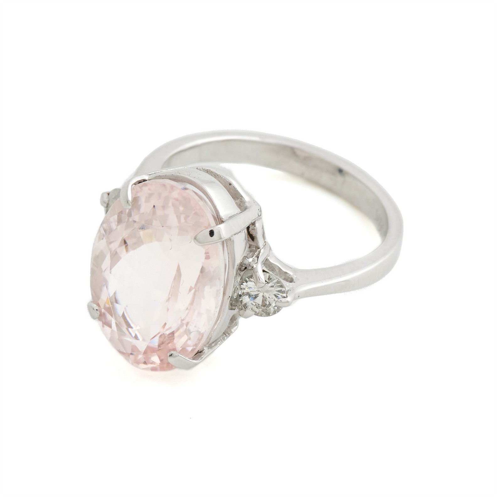 A MORGANITE AND DIAMOND RING IN 18CT WHITE GOLD, THE MORGANITE WEIGHING APPROXIMATELY 7.85CTS, THE DIAMONDS TOTALLING APPROXIMATELY 0.40CTS, SIZE N, 6.0GMS, ACCOMPANIED BY A VALUATION