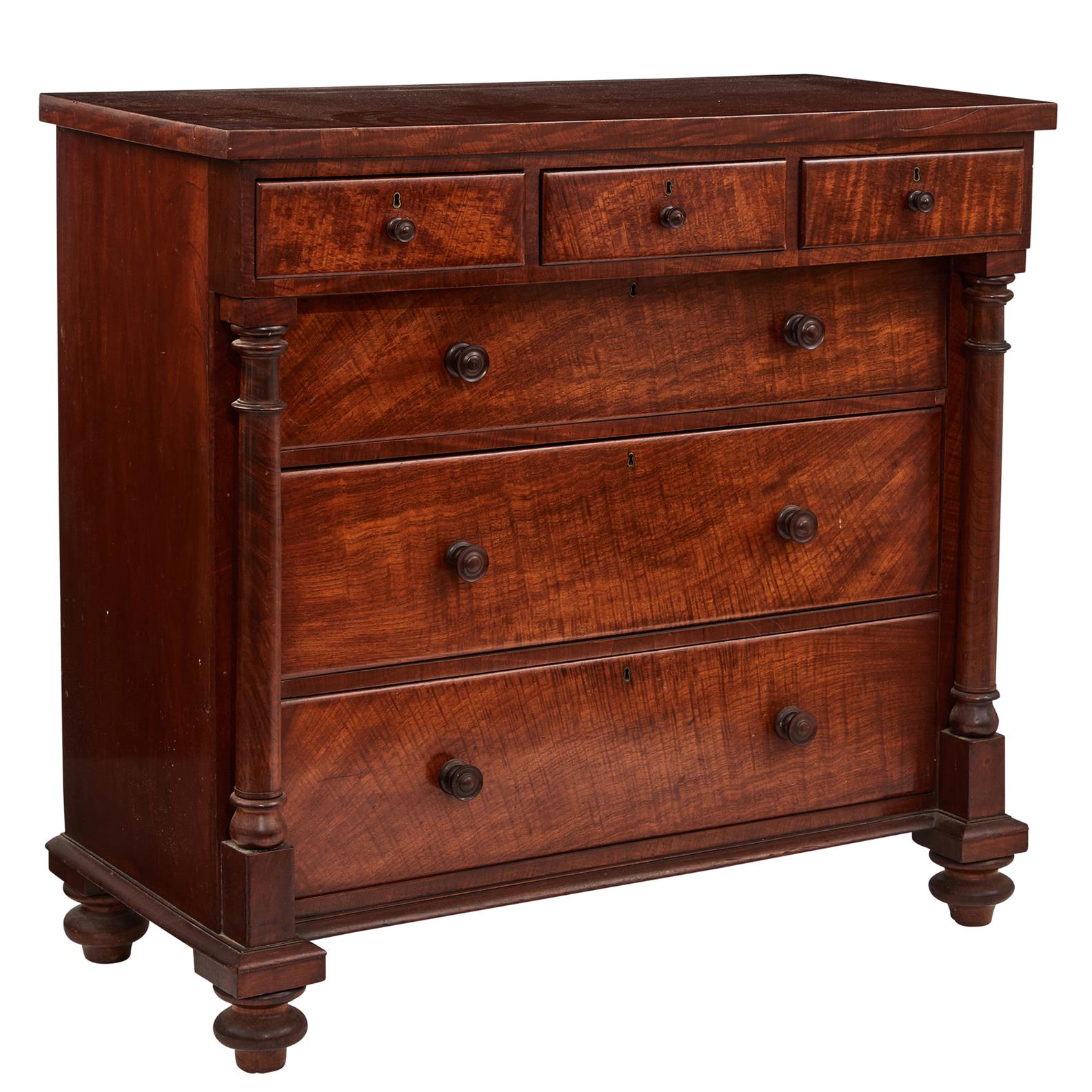 The top seems to have been polished but below the chest is in fairly original condition. Small loss to front edge, gouge in front edge, sun fading to right hand side, small crack to left hand side small piece of veneer missing between drawers, bottom part of one handle missing. Photos make it look yellower than in reality, it has a good colour.