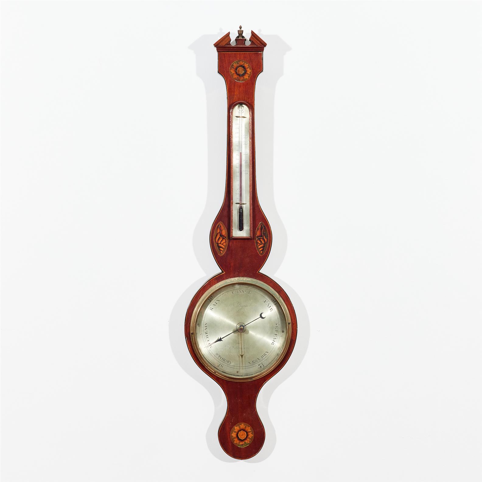 A GEORGE III MAHOGANY AND INLAID BANJO BAROMETER BY A. PAGANI, NOTTINGHAM