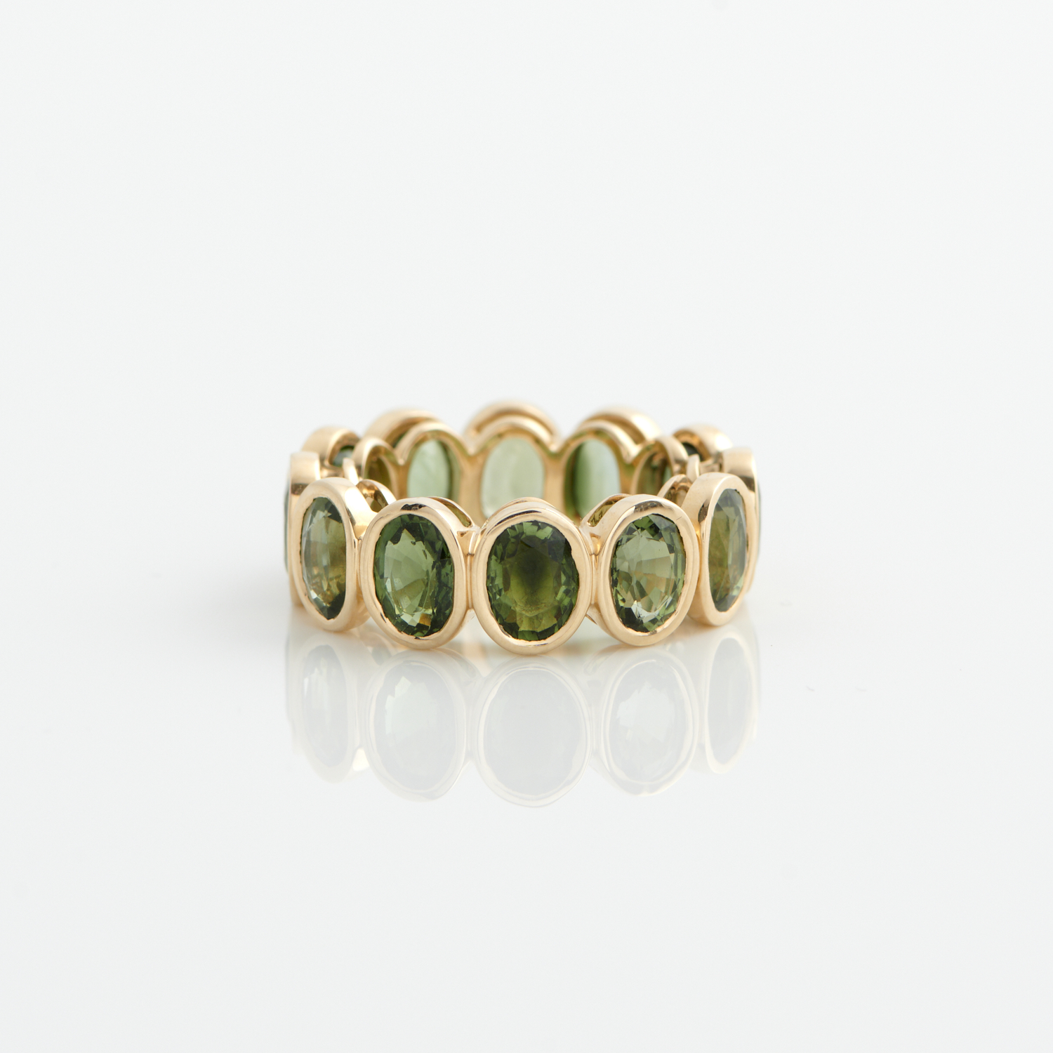 A TOURMALINE ETERNITY RING IN 14CT GOLD, THE TOURMALINES TOTALLING APPROXIMATELY 10.77CTS, SIZE N-O, 7.4GMS