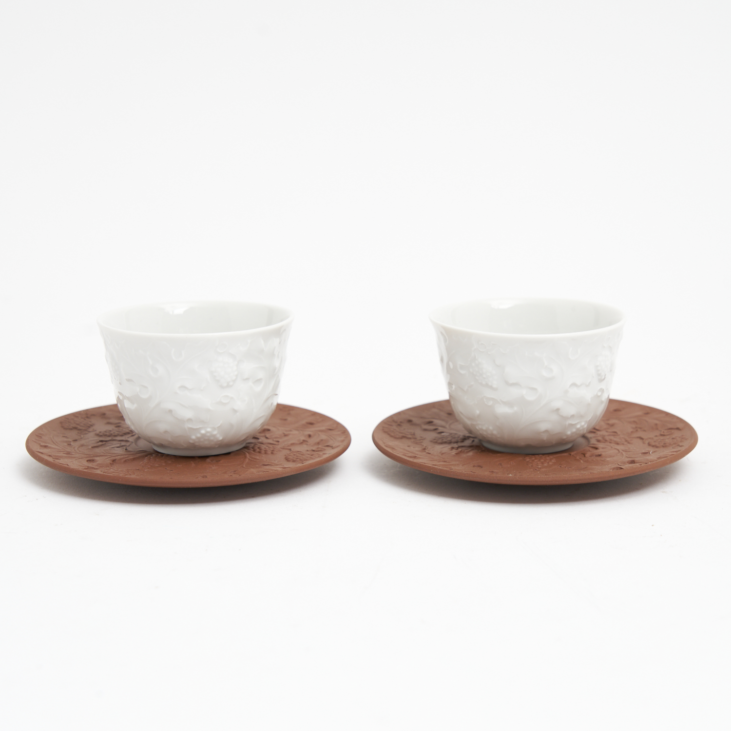 A PAIR OF MEISSEN WHITE-GLAZED PORCELAIN TEA BOWLS MATCHED WITH MEISSEN BÖTTGER STONEWARE SAUCERS, ALL WITH GRAPEVINE DECORATION IN RELIEF, LEONARD JOEL DELIVERY SIZE: SMALL