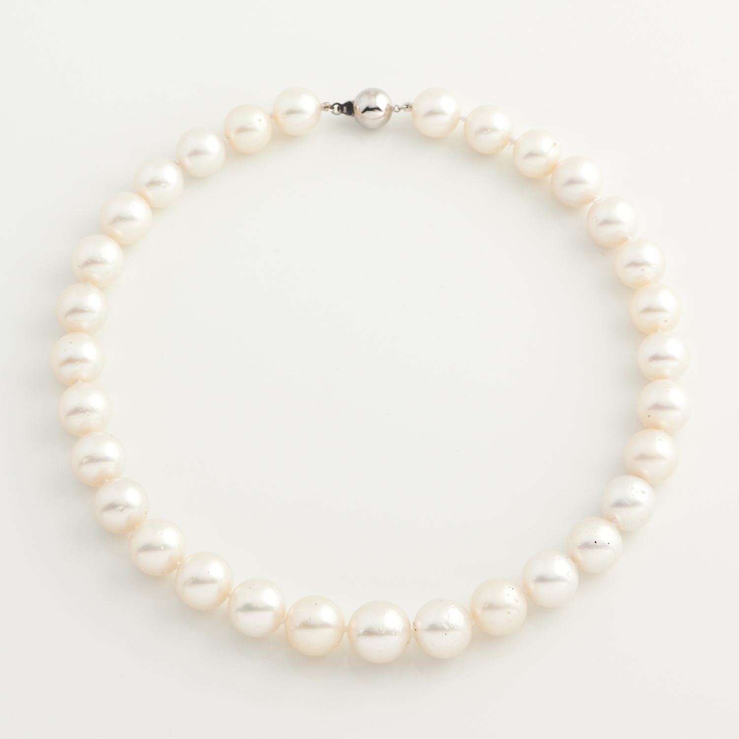 A STRAND OF SOUTH SEA PEARLS, TO A CLASP IN 18CT WHITE GOLD, THE PEARLS MEASURING APPROXIMATELY 12.0MM - 14.5MM, 455MM