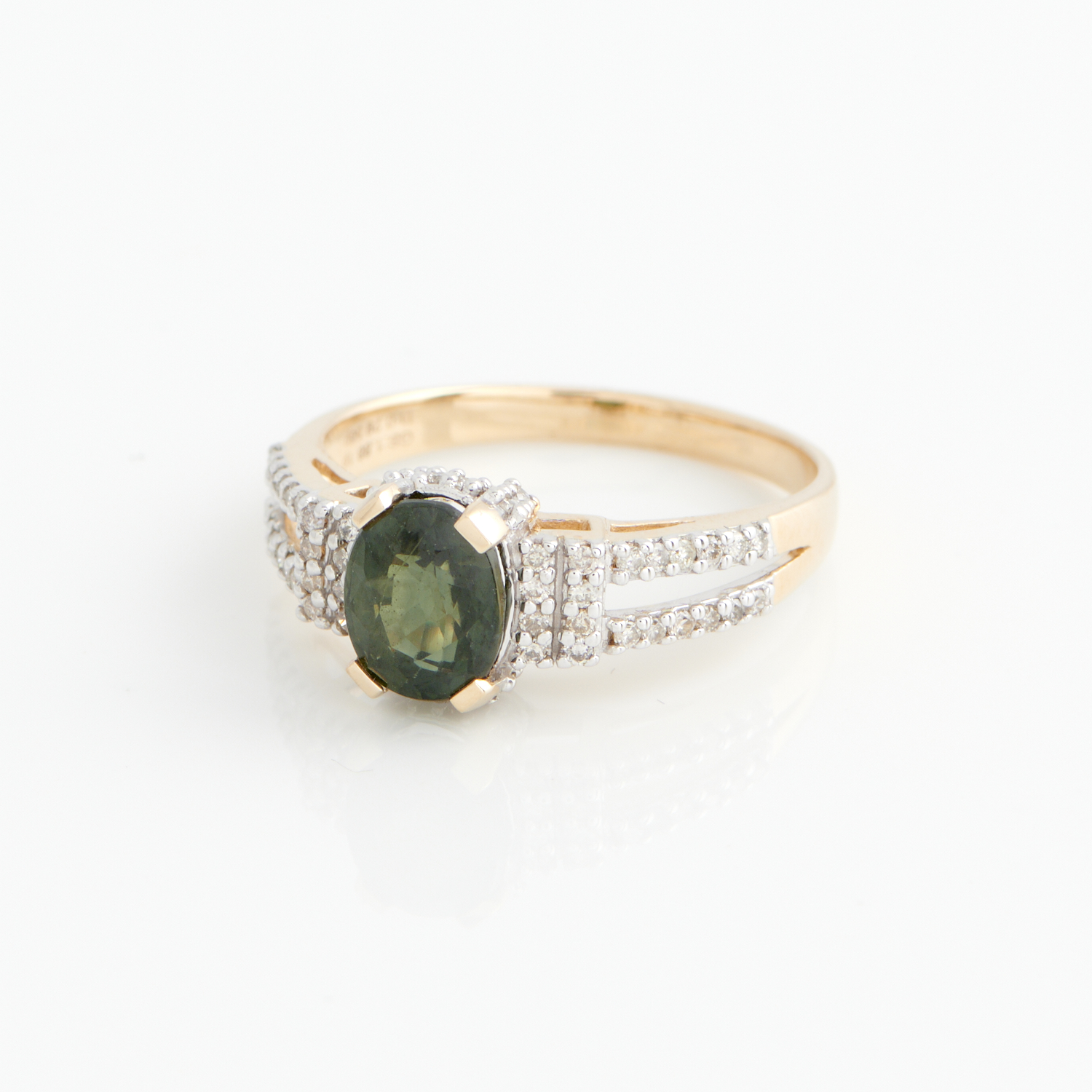 A GREEN SAPPHIRE AND DIAMOND RING IN 14CT GOLD, THE SAPPHIRE WEIGHING 1.88CTS, THE DIAMONDS TOTALLING 0.259CTS, SIZE N, 3.0GMS