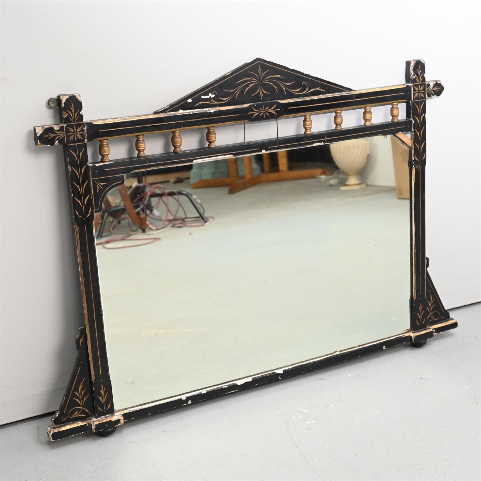 A 19TH CENTURY ENGLISH EBONISED AND GILT DECORATED OVER MANTLE MIRROR (A/F) (80H X 115W CM) (LEONARD JOEL DELIVERY SIZE: LARGE)