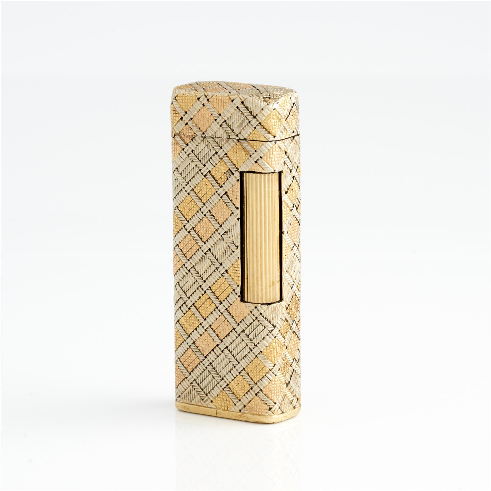 DUNHILL, A VINTAGE LIGHTER TO AN OUTER JACKET IN TRI-TONE 18CT GOLD, FEATURING A CRISS-CROSS PATTERN