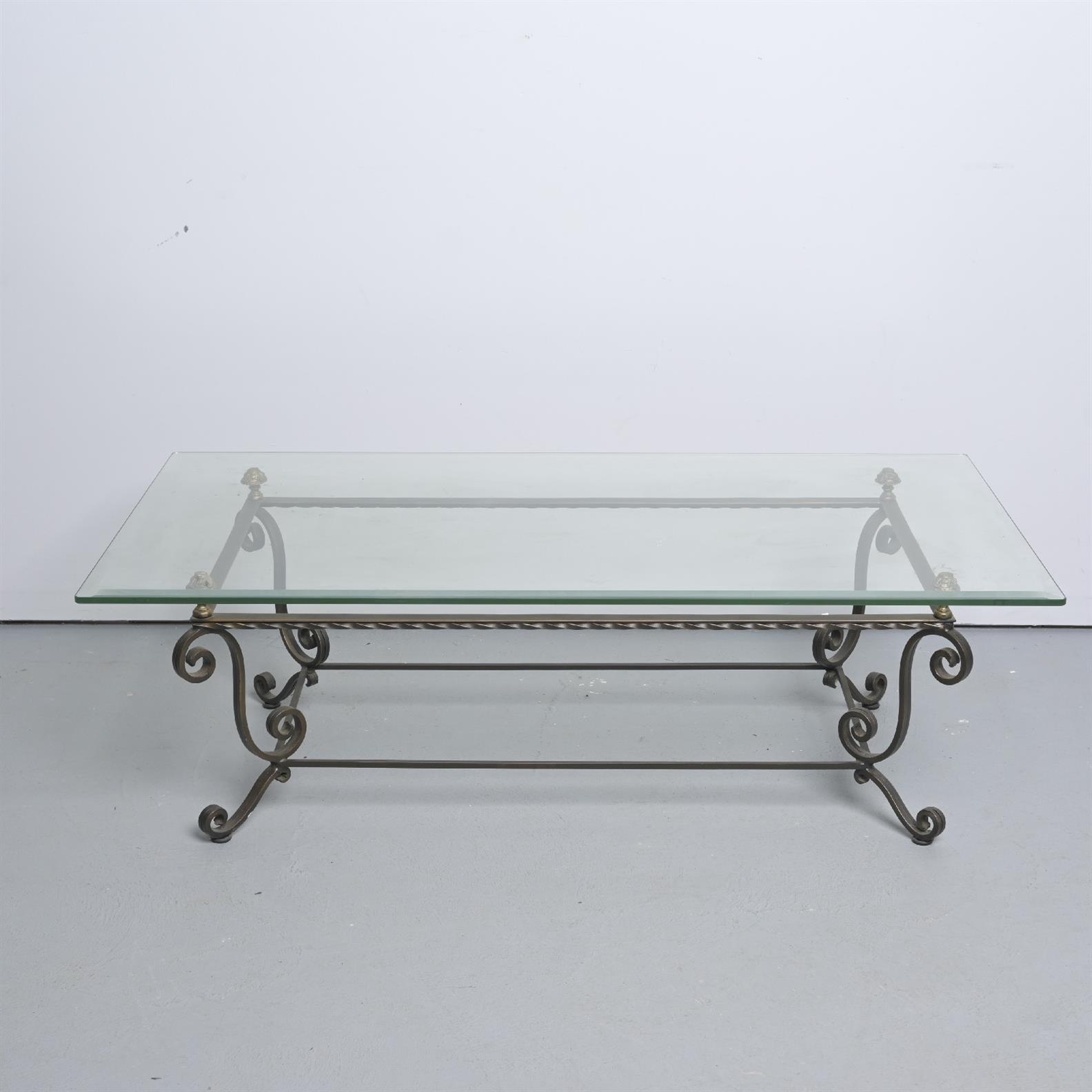 A METAL FRAMED AND GLASS TOP COFFEE TABLE (41H X 130W X 70D CM) (LEONARD JOEL DELIVERY SIZE: X-LARGE)