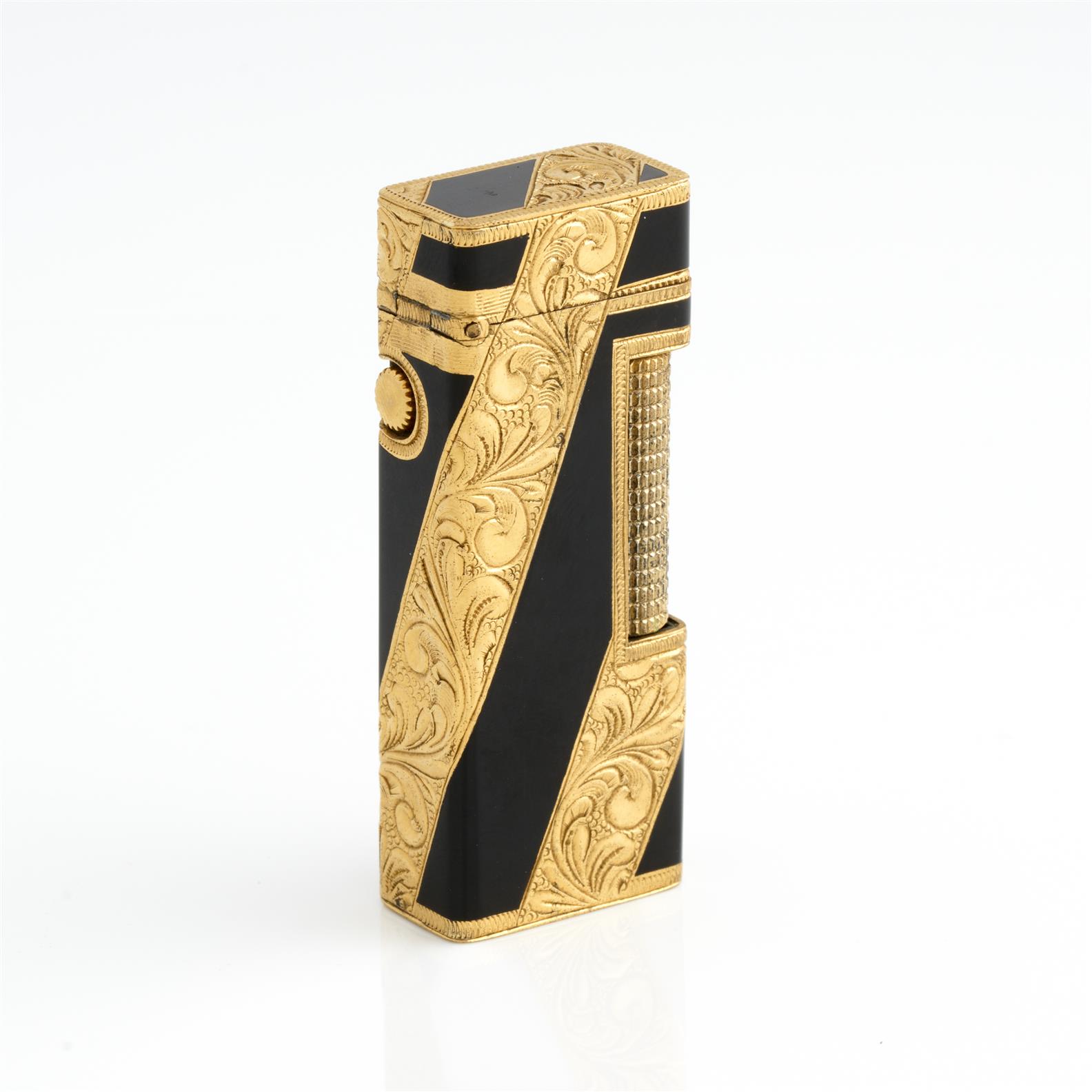 DUNHILL, A VINTAGE ENAMEL SET LIGHTER TO AN OUTER JACKET IN GOLD PLATE
