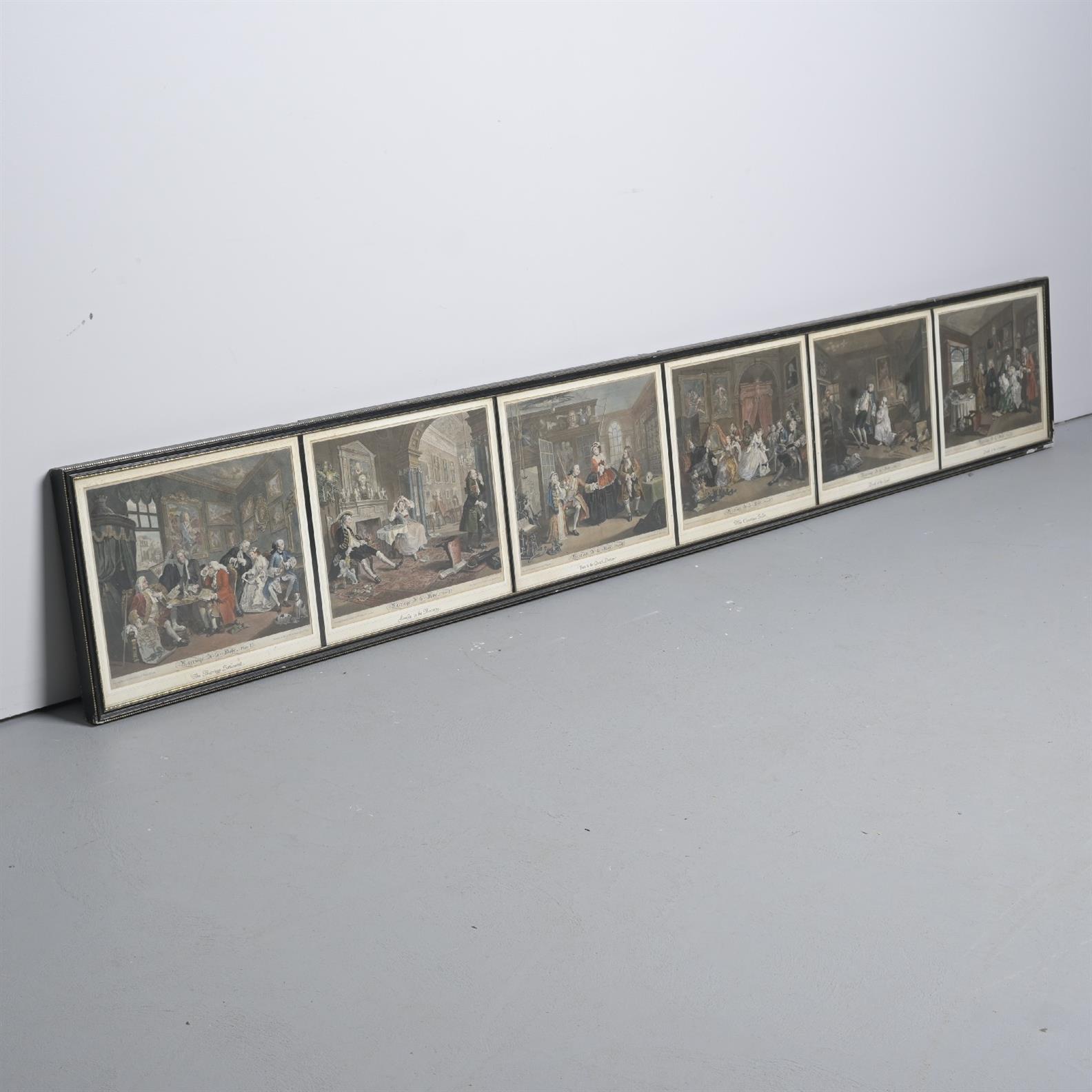 WILLIAM HOGARTH (1697–1764) ‘MARRIAGE À-LA-MODE', THE SUITE OF SIX FRAMED AS ONE, HAND-COLOURED ENGRAVINGS (1745, BUT THIS SET PROBABLY PRINTED LATER 18th / EARLY 19th CENTURY) (49H X 304W X 5D CM - FRAME) (THIS ITEM MUST BE REMOVED BY CARRIERS AT THE CUSTOMER'S EXPENSE. LEONARD JOEL STAFF CANNOT ASSIST CARRYING THIS ITEM)